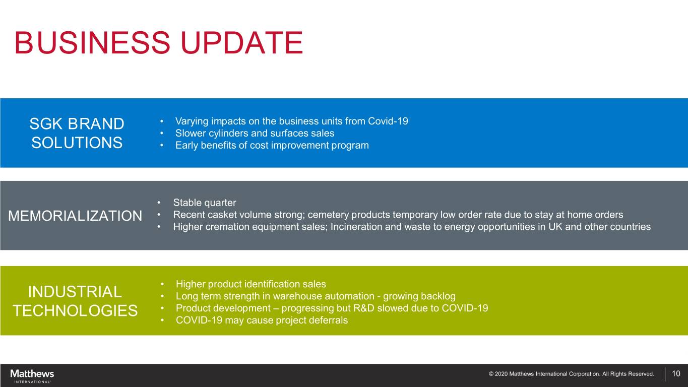 BUSINESS UPDATE SGK BRAND • Varying impacts on the business units from Covid-19 • Slower cylinders and surfaces sales SOLUTIONS • Early benefits of cost improvement program • Stable quarter MEMORIALIZATION • Recent casket volume strong; cemetery products temporary low order rate due to stay at home orders • Higher cremation equipment sales; Incineration and waste to energy opportunities in UK and other countries • Higher product identification sales INDUSTRIAL • Long term strength in warehouse automation - growing backlog TECHNOLOGIES • Product development – progressing but R&D slowed due to COVID-19 • COVID-19 may cause project deferrals © 2020 Matthews International Corporation. All Rights Reserved. 10