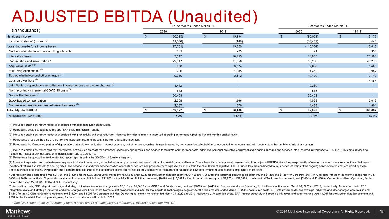 ADJUSTED NET INCOME AND EARNINGS PER SHARE NON-GAAP RECONCILIATION (Unaudited) (In thousands, except per share data) Three Months Ended March 31, Six Months Ended March 31, 2020 2019 2020 2019 per share per share per share per share Net (loss) income attributable to Matthews $ (86,364) $ (2.77) $ 15,417 $ 0.48 $ (96,830) $ (3.11) $ 18,514 $ 0.58 Acquisition costs 495 0.01 2,496 0.08 1,956 0.07 4,000 0.13 ERP integration costs 562 0.01 1,336 0.04 1,061 0.03 2,947 0.09 Strategic initiatives and other charges 7,050 0.23 1,563 0.05 14,738 0.47 1,563 0.05 Loss on divestiture - - - - - - 3,304 0.10 Joint Venture intangible amortization expense and other charges (1) 667 0.02 - - 872 0.03 - - Non-recurring / incremental COVID-19 costs (2) 497 0.02 - - 497 0.02 - - Goodwill write-down 81,861 2.63 - - 81,861 2.63 - - Non-service pension and postretirement expense (3) 1,670 0.05 719 0.03 3,341 0.10 1,408 0.05 Intangible amortization expense 13,404 0.43 7,036 0.22 26,861 0.86 13,040 0.41 Tax-related - - - - - - (300) (0.01) Adjusted net income $ 19,842 $ 0.63 $ 28,567 $ 0.90 $ 34,357 $ 1.10 $ 44,476 $ 1.40 Note: Adjustments to net income for non-GAAP reconciling items were calculated using an income tax rate of 25% for the three and six months ended March 31, 2020, and 26% for the three and six months ended March 31, 2019. (1) Represents the Company's portion of intangible amortization expense and other non-recurring charges incurred by non-consolidated subsidiaries accounted for as equity-method investments within the Memorialization segment. (2) Includes certain non-recurring direct incremental costs (such as costs for purchases of computer peripherals and devices to facilitate working-from-home, additional personal protective equipment and cleaning supplies and services, etc.) incurred in response to COVID-19. This amount does not include the impact of any lost sales or underutilization due to COVID-19. (3) The non-GAAP adjustment to pension and postretirement expense represents the add-back of the non-service related components of these costs. Non-service related components include interest cost, expected return on plan assets and amortization of actuarial gains and losses. The service cost and prior service cost components of pension and postretirement expense are considered to be a better reflection of the ongoing service-related costs of providing these benefits. The other components of GAAP pension and postretirement expense are primarily influenced by general market conditions impacting investment returns and interest (discount) rates. Please note that GAAP pension and postretirement expense or the adjustment above are not necessarily indicative of the current or future cash flow requirements related to these employee benefit plans. * See Disclaimer (page 2) for Management’s assessment of supplemental information related to adjusted net income and adjusted EPS. © 2020 Matthews International Corporation. All Rights Reserved. 14