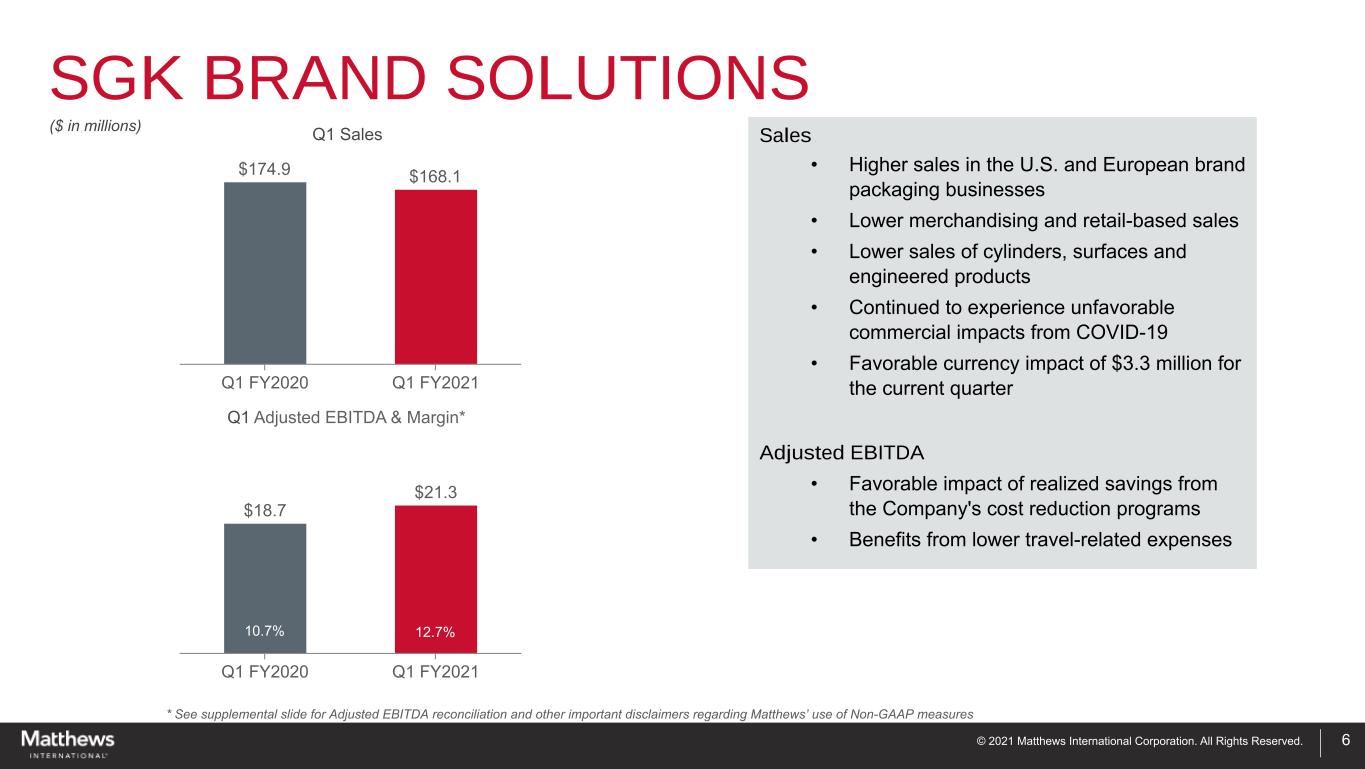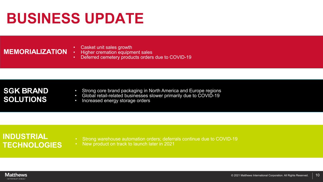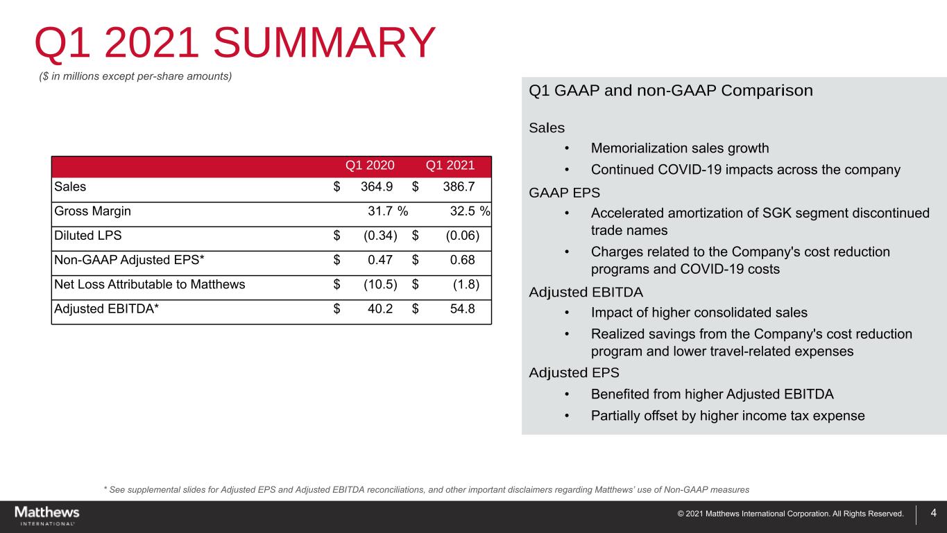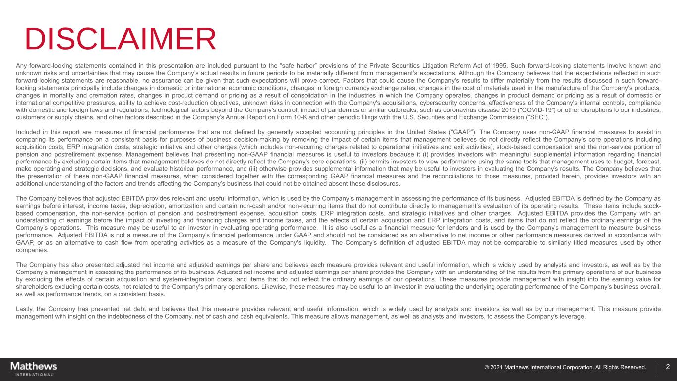 © 2021 Matthews International Corporation. All Rights Reserved. DISCLAIMER 2 Any forward-looking statements contained in this presentation are included pursuant to the “safe harbor” provisions of the Private Securities Litigation Reform Act of 1995. Such forward-looking statements involve known and unknown risks and uncertainties that may cause the Company’s actual results in future periods to be materially different from management’s expectations. Although the Company believes that the expectations reflected in such forward-looking statements are reasonable, no assurance can be given that such expectations will prove correct. Factors that could cause the Company's results to differ materially from the results discussed in such forward- looking statements principally include changes in domestic or international economic conditions, changes in foreign currency exchange rates, changes in the cost of materials used in the manufacture of the Company's products, changes in mortality and cremation rates, changes in product demand or pricing as a result of consolidation in the industries in which the Company operates, changes in product demand or pricing as a result of domestic or international competitive pressures, ability to achieve cost-reduction objectives, unknown risks in connection with the Company's acquisitions, cybersecurity concerns, effectiveness of the Company's internal controls, compliance with domestic and foreign laws and regulations, technological factors beyond the Company's control, impact of pandemics or similar outbreaks, such as coronavirus disease 2019 ("COVID-19") or other disruptions to our industries, customers or supply chains, and other factors described in the Company’s Annual Report on Form 10-K and other periodic filings with the U.S. Securities and Exchange Commission (“SEC”). Included in this report are measures of financial performance that are not defined by generally accepted accounting principles in the United States (“GAAP”). The Company uses non-GAAP financial measures to assist in comparing its performance on a consistent basis for purposes of business decision-making by removing the impact of certain items that management believes do not directly reflect the Company’s core operations including acquisition costs, ERP integration costs, strategic initiative and other charges (which includes non-recurring charges related to operational initiatives and exit activities), stock-based compensation and the non-service portion of pension and postretirement expense. Management believes that presenting non-GAAP financial measures is useful to investors because it (i) provides investors with meaningful supplemental information regarding financial performance by excluding certain items that management believes do not directly reflect the Company’s core operations, (ii) permits investors to view performance using the same tools that management uses to budget, forecast, make operating and strategic decisions, and evaluate historical performance, and (iii) otherwise provides supplemental information that may be useful to investors in evaluating the Company’s results. The Company believes that the presentation of these non-GAAP financial measures, when considered together with the corresponding GAAP financial measures and the reconciliations to those measures, provided herein, provides investors with an additional understanding of the factors and trends affecting the Company’s business that could not be obtained absent these disclosures. The Company believes that adjusted EBITDA provides relevant and useful information, which is used by the Company’s management in assessing the performance of its business. Adjusted EBITDA is defined by the Company as earnings before interest, income taxes, depreciation, amortization and certain non-cash and/or non-recurring items that do not contribute directly to management’s evaluation of its operating results. These items include stock- based compensation, the non-service portion of pension and postretirement expense, acquisition costs, ERP integration costs, and strategic initiatives and other charges. Adjusted EBITDA provides the Company with an understanding of earnings before the impact of investing and financing charges and income taxes, and the effects of certain acquisition and ERP integration costs, and items that do not reflect the ordinary earnings of the Company’s operations. This measure may be useful to an investor in evaluating operating performance. It is also useful as a financial measure for lenders and is used by the Company’s management to measure business performance. Adjusted EBITDA is not a measure of the Company's financial performance under GAAP and should not be considered as an alternative to net income or other performance measures derived in accordance with GAAP, or as an alternative to cash flow from operating activities as a measure of the Company's liquidity. The Company's definition of adjusted EBITDA may not be comparable to similarly titled measures used by other companies. The Company has also presented adjusted net income and adjusted earnings per share and believes each measure provides relevant and useful information, which is widely used by analysts and investors, as well as by the Company’s management in assessing the performance of its business. Adjusted net income and adjusted earnings per share provides the Company with an understanding of the results from the primary operations of our business by excluding the effects of certain acquisition and system-integration costs, and items that do not reflect the ordinary earnings of our operations. These measures provide management with insight into the earning value for shareholders excluding certain costs, not related to the Company’s primary operations. Likewise, these measures may be useful to an investor in evaluating the underlying operating performance of the Company’s business overall, as well as per