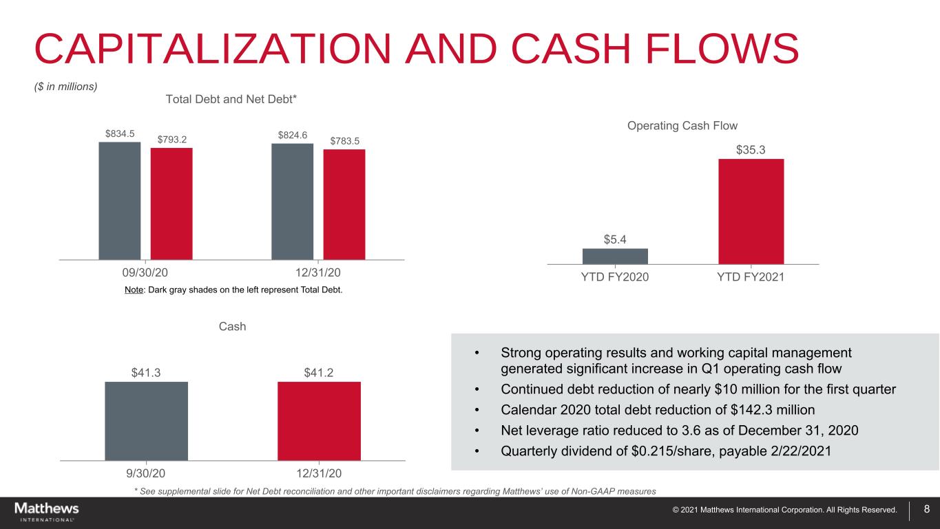 © 2021 Matthews International Corporation. All Rights Reserved. • Strong operating results and working capital management generated significant increase in Q1 operating cash flow • Continued debt reduction of nearly $10 million for the first quarter • Calendar 2020 total debt reduction of $142.3 million • Net leverage ratio reduced to 3.6 as of December 31, 2020 • Quarterly dividend of $0.215/share, payable 2/22/2021 CAPITALIZATION AND CASH FLOWS 8 * See supplemental slide for Net Debt reconciliation and other important disclaimers regarding Matthews’ use of Non-GAAP measures Note: Dark gray shades on the left represent Total Debt. Total Debt and Net Debt* $834.5 $824.6$793.2 $783.5 09/30/20 12/31/20 ($ in millions) Cash $41.3 $41.2 9/30/20 12/31/20 Operating Cash Flow $5.4 $35.3 YTD FY2020 YTD FY2021