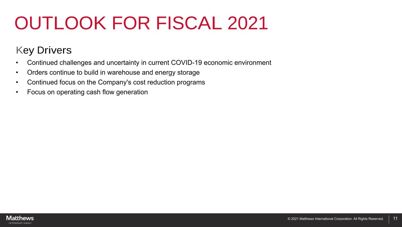 © 2021 Matthews International Corporation. All Rights Reserved. 10 BUSINESS UPDATE SGK BRAND SOLUTIONS MEMORIALIZATION INDUSTRIAL TECHNOLOGIES • Casket unit sales growth • Higher cremation equipment sales • Deferred cemetery products orders due to COVID-19 • Strong core brand packaging in North America and Europe regions • Global retail-related businesses slower primarily due to COVID-19 • Increased energy storage orders • Strong warehouse automation orders; deferrals continue due to COVID-19 • New product on track to launch later in 2021