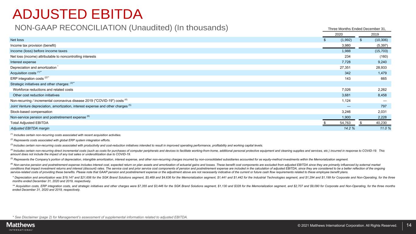 © 2021 Matthews International Corporation. All Rights Reserved. 13 Included in this report are measures of financial performance that are not defined by generally accepted accounting principles in the United States (“GAAP”). The Company uses non-GAAP financial measures to assist in comparing its performance on a consistent basis for purposes of business decision-making by removing the impact of certain items that management believes do not directly reflect the Company’s core operations including acquisition costs, ERP integration costs, strategic initiative and other charges (which includes non-recurring charges related to operational initiatives and exit activities), stock-based compensation and the non-service portion of pension and postretirement expense. Management believes that presenting non-GAAP financial measures is useful to investors because it (i) provides investors with meaningful supplemental information regarding financial performance by excluding certain items that management believes do not directly reflect the Company’s core operations, (ii) permits investors to view performance using the same tools that management uses to budget, forecast, make operating and strategic decisions, and evaluate historical performance, and (iii) otherwise provides supplemental information that may be useful to investors in evaluating the Company’s results. The Company believes that the presentation of these non-GAAP financial measures, when considered together with the corresponding GAAP financial measures and the reconciliations to those measures, provided herein, provides investors with an additional understanding of the factors and trends affecting the Company’s business that could not be obtained absent these disclosures. RECONCILIATIONS OF NON-GAAP FINANCIAL MEASURES