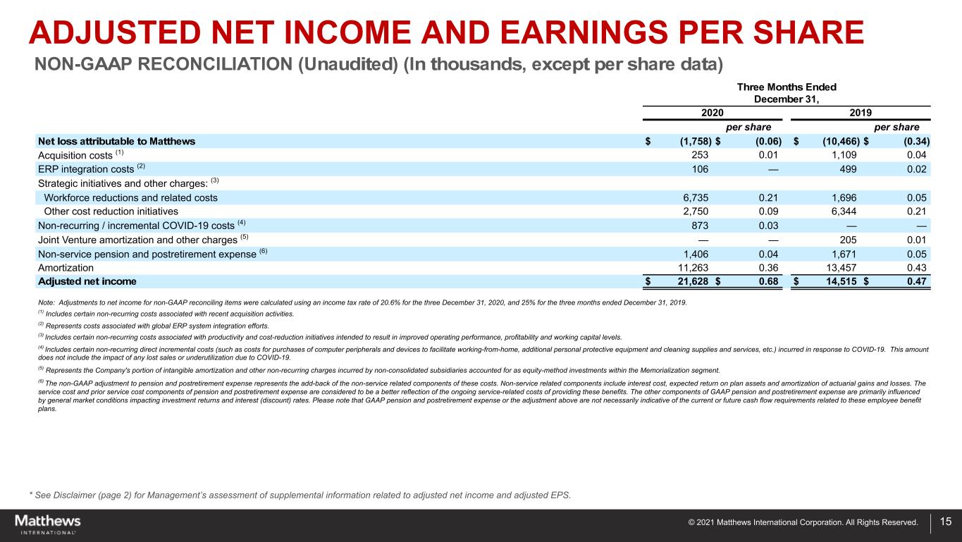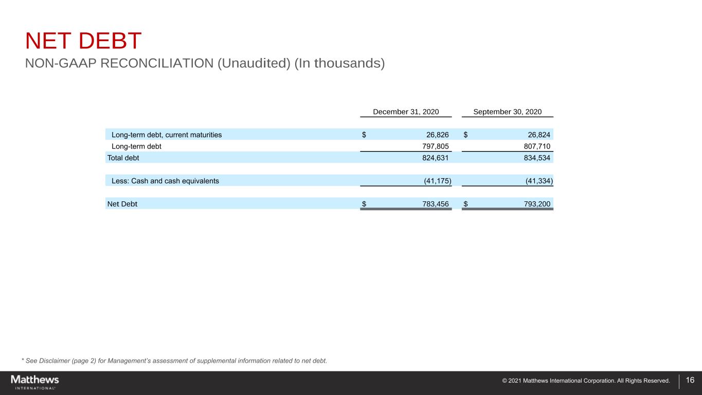© 2021 Matthews International Corporation. All Rights Reserved. ADJUSTED NET INCOME AND EARNINGS PER SHARE NON-GAAP RECONCILIATION (Unaudited) (In thousands, except per share data) * See Disclaimer (page 2) for Management’s assessment of supplemental information related to adjusted net income and adjusted EPS. 15 Three Months Ended December 31, 2020 2019 per share per share Net loss attributable to Matthews $ (1,758) $ (0.06) $ (10,466) $ (0.34) Acquisition costs (1) 253 0.01 1,109 0.04 ERP integration costs (2) 106 — 499 0.02 Strategic initiatives and other charges: (3) Workforce reductions and related costs 6,735 0.21 1,696 0.05 Other cost reduction initiatives 2,750 0.09 6,344 0.21 Non-recurring / incremental COVID-19 costs (4) 873 0.03 — — Joint Venture amortization and other charges (5) — — 205 0.01 Non-service pension and postretirement expense (6) 1,406 0.04 1,671 0.05 Amortization 11,263 0.36 13,457 0.43 Adjusted net income $ 21,628 $ 0.68 $ 14,515 $ 0.47 Note: Adjustments to net income for non-GAAP reconciling items were calculated using an income tax rate of 20.6% for the three December 31, 2020, and 25% for the three months ended December 31, 2019. (1) Includes certain non-recurring costs associated with recent acquisition activities. (2) Represents costs associated with global ERP system integration efforts. (3) Includes certain non-recurring costs associated with productivity and cost-reduction initiatives intended to result in improved operating performance, profitability and working capital levels. (4) Includes certain non-recurring direct incremental costs (such as costs for purchases of computer peripherals and devices to facilitate working-from-home, additional personal protective equipment and cleaning supplies and services, etc.) incurred in response to COVID-19. This amount does not include the impact of any lost sales or underutilization due to COVID-19. (5) Represents the Company's portion of intangible amortization and other non-recurring charges incurred by non-consolidated subsidiaries accounted for as equity-method investments within the Memorialization segment. (6) The non-GAAP adjustment to pension and postretirement expense represents the add-back of the non-service related components of these costs. Non-service related components include interest cost, expected return on plan assets and amortization of actuarial gains and losses. The service cost and prior service cost components of pension and postretirement expense are considered to be a better reflection of the ongoing service-related costs of providing these benefits. The other components of GAAP pension and postretirement expense are primarily influenced by general market conditions impacting investment returns and interest (discount) rates. Please note that GAAP pension and postretirement expense or the adjustment above are not necessarily indicative of the current or future cash flow requirements related to these employee benefit plans.