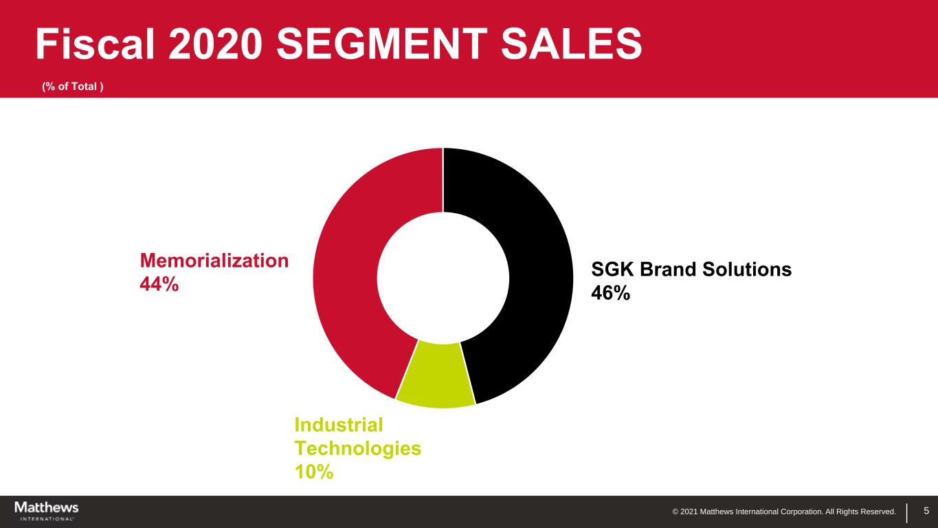 © 2021 Matthews International Corporation. All Rights Reserved. 4 FOUNDED in 1850 • Marking Products • Printing Plates • Bronze Plaques ROOTED IN IDENTIFICATION PRODUCTS TODAY • Industrial Technologies • SGK Brand Solution • Memorialization
