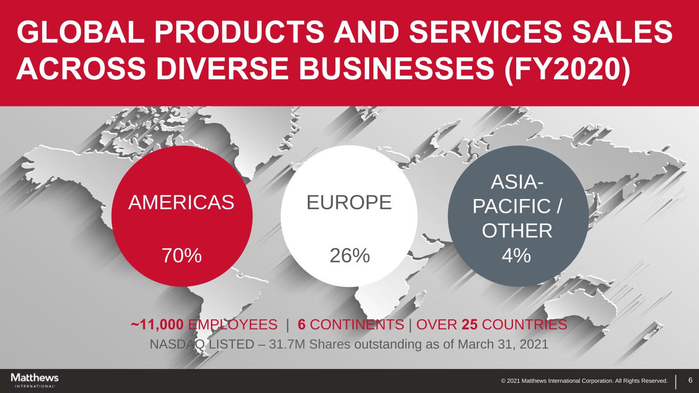 © 2021 Matthews International Corporation. All Rights Reserved. 5 Fiscal 2020 SEGMENT SALES (% of Total ) SGK Brand Solutions 46% Industrial Technologies 10% Memorialization 44%