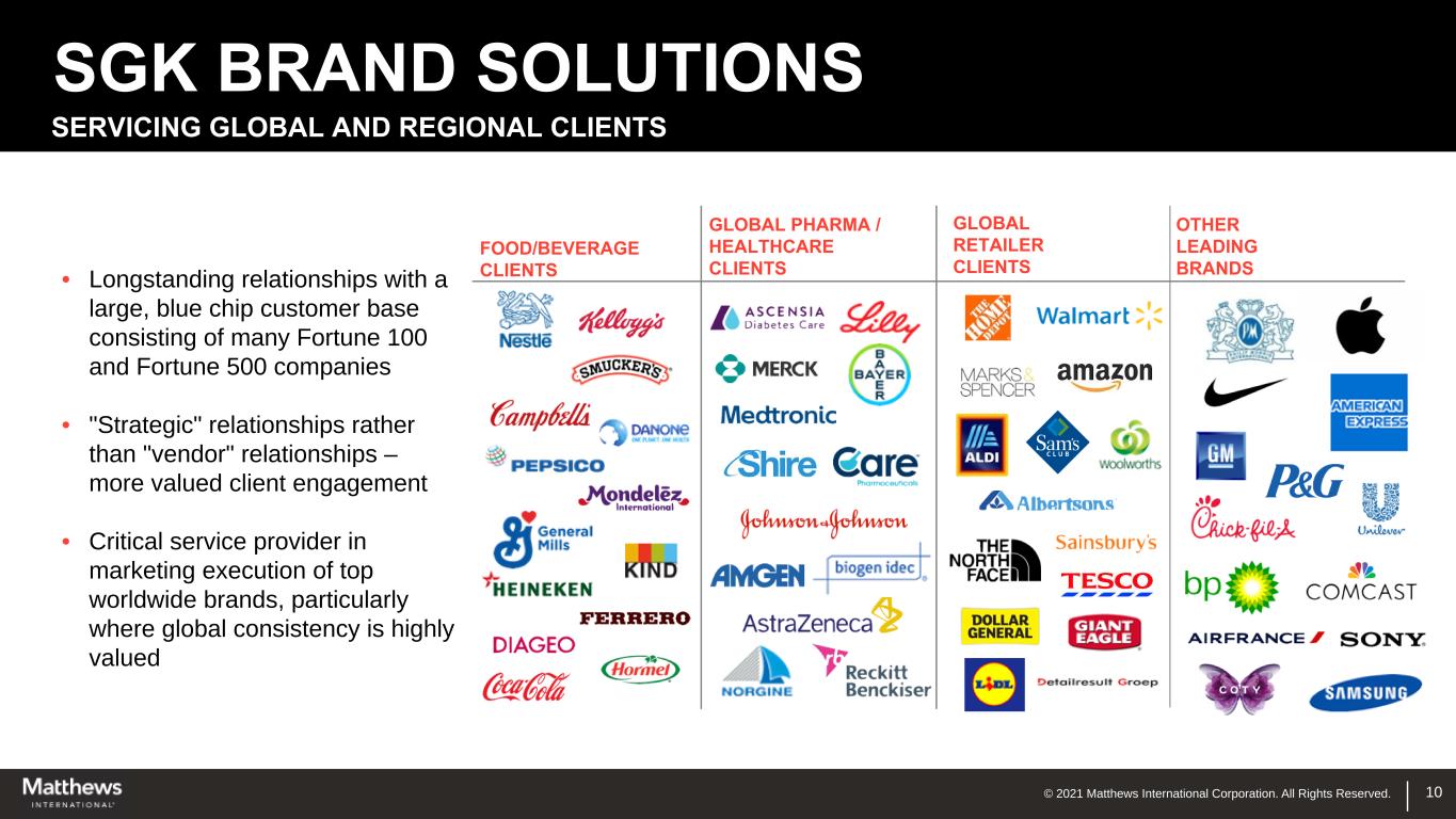 © 2021 Matthews International Corporation. All Rights Reserved. SGK BRAND SOLUTIONS FOOD/BEVERAGE CLIENTS GLOBAL PHARMA / HEALTHCARE CLIENTS GLOBAL RETAILER CLIENTS OTHER LEADING BRANDS 10 SERVICING GLOBAL AND REGIONAL CLIENTS • Longstanding relationships with a large, blue chip customer base consisting of many Fortune 100 and Fortune 500 companies • "Strategic" relationships rather than "vendor" relationships – more valued client engagement • Critical service provider in marketing execution of top worldwide brands, particularly where global consistency is highly valued