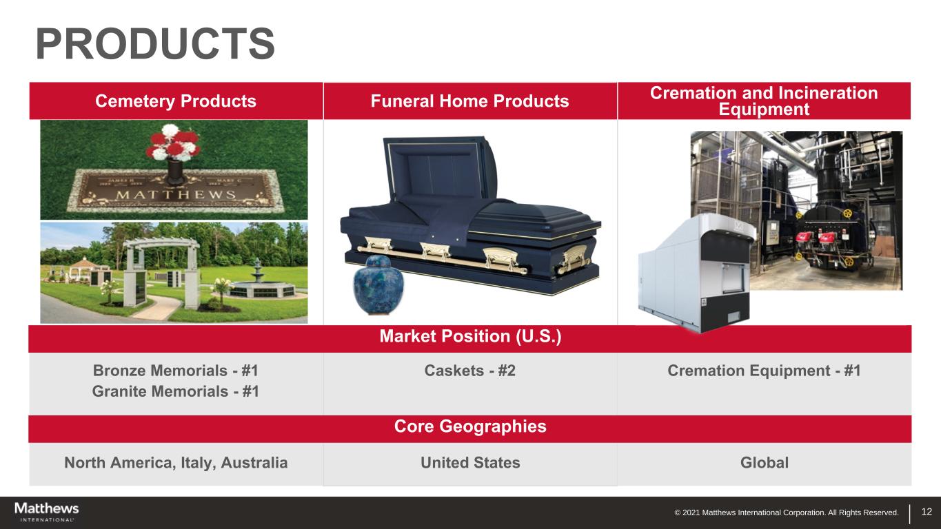 © 2021 Matthews International Corporation. All Rights Reserved. PRODUCTS Cemetery Products Bronze Memorials - #1 Granite Memorials - #1 North America, Italy, Australia 12 Funeral Home Products Caskets - #2 United States Cremation and Incineration Equipment Cremation Equipment - #1 Global Market Position (U.S.) Core Geographies