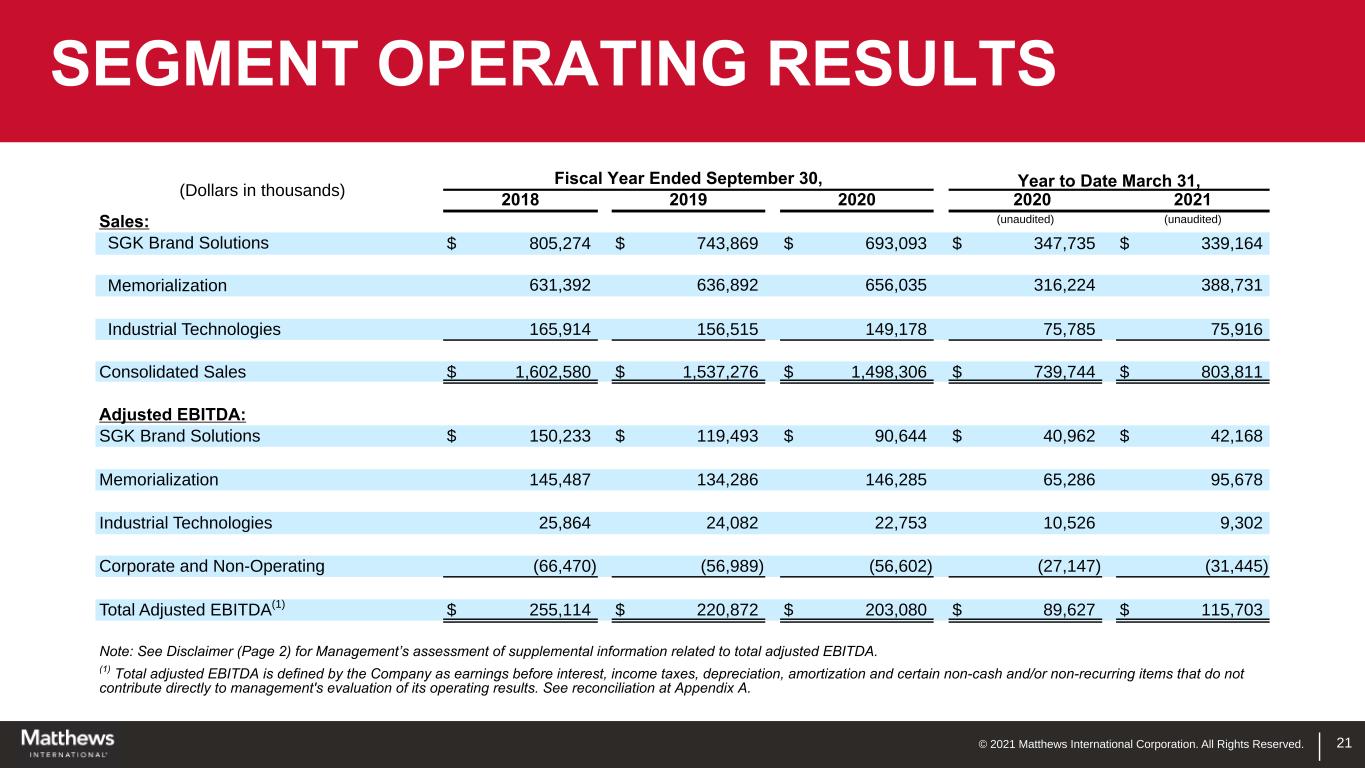 © 2021 Matthews International Corporation. All Rights Reserved. 20 CONSOLIDATED RESULTS (Dollars in thousands, except per share data) Fiscal Year Ended September 30, Year to Date March 31, 2018 2019 2020 2020 2021 (unaudited) (unaudited) Consolidated Sales $ 1,602,580 $ 1,537,276 $ 1,498,306 $ 739,744 $ 803,811 Net Income Attributable to Matthews $ 107,371 $ (37,988) $ (87,155) $ (96,830) $ 3,231 Total Adjusted EBITDA(1) $ 255,114 $ 220,872 $ 203,080 $ 89,627 $ 115,703 Diluted EPS $ 3.37 $ (1.21) $ (2.79) $ (3.11) $ 0.10 Non-GAAP Adjusted EPS(2) $ 3.96 $ 3.31 $ 3.01 $ 1.10 $ 1.57 Note: See Disclaimer (Page 2) for Management’s assessment of supplemental information related to total adjusted EBITDA and non-GAAP adjusted EPS. (1) Total adjusted EBITDA is defined by the Company as earnings before interest, income taxes, depreciation, amortization and certain non-cash and/or non-recurring items that do not contribute directly to management's evaluation of its operating results. See reconciliation at Appendix A. (2) Non-GAAP adjusted EPS reflects certain adjustments to facilitate comparability and excludes intangible amortization and the non-service cost portion of pension/post-retirement expense. See reconciliation at Appendix B.