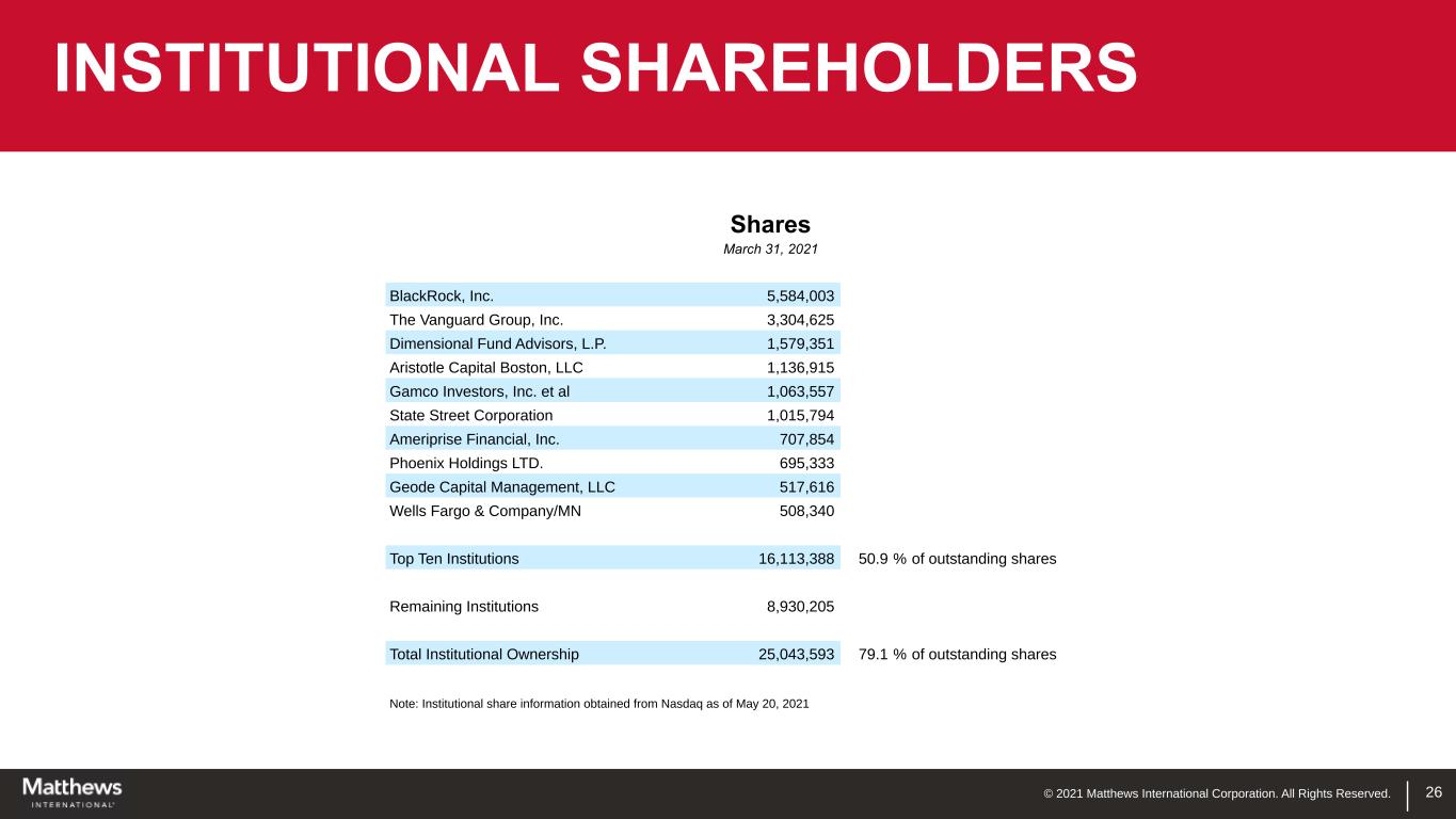 © 2021 Matthews International Corporation. All Rights Reserved. 25 Debt Reduction • Continued Q2 debt reduction of $42.1M • Last twelve month debt reduction of $183.3M • Near-term focus of cash flow and continued debt reduction Cash Dividend • $0.21 per share quarterly for FY2020 • $0.215 per share for Q2 FY2021 Invest in Growth • Capital investment of ~ 2.5% of revenue Acquisitions • Extend capabilities in existing businesses • Geographic expansion Share Repurchases • Opportunistic repurchase in periods of excess cash flow • 0.4 million shares authorized CAPITAL ALLOCATION PRIORITIES * See Appendix D for Net Debt reconciliation and Disclaimer (page 2) for Management’s assessment of supplemental information related to net debt. (in millions) Total Debt and Net Debt* $940.7 $834.5 $782.5 $905.4 $793.2 $735.5 Total Debt Net Debt 09/30/19 09/30/20 03/31/21