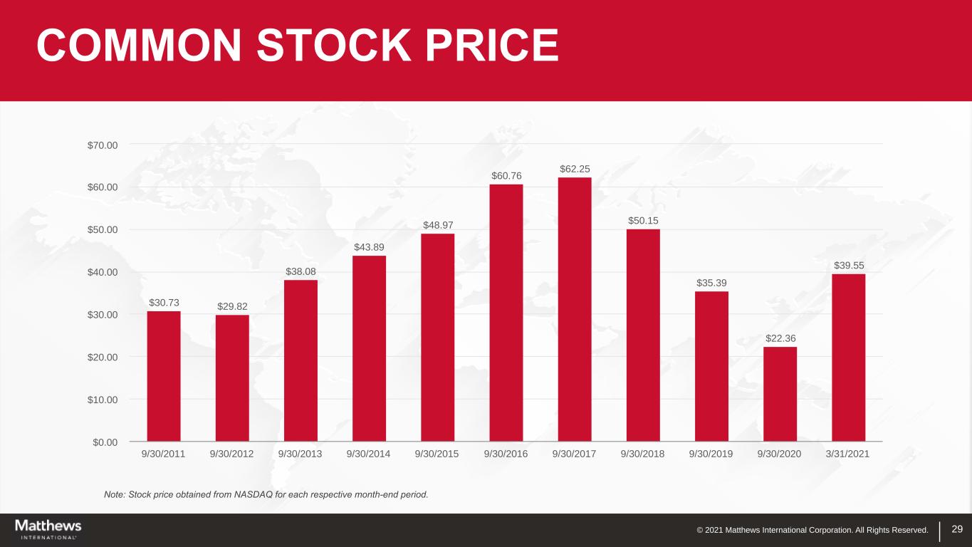 © 2021 Matthews International Corporation. All Rights Reserved. 29 COMMON STOCK PRICE Note: Stock price obtained from NASDAQ for each respective month-end period. $30.73 $29.82 $38.08 $43.89 $48.97 $60.76 $62.25 $50.15 $35.39 $22.36 $39.55 9/30/2011 9/30/2012 9/30/2013 9/30/2014 9/30/2015 9/30/2016 9/30/2017 9/30/2018 9/30/2019 9/30/2020 3/31/2021 $0.00 $10.00 $20.00 $30.00 $40.00 $50.00 $60.00 $70.00