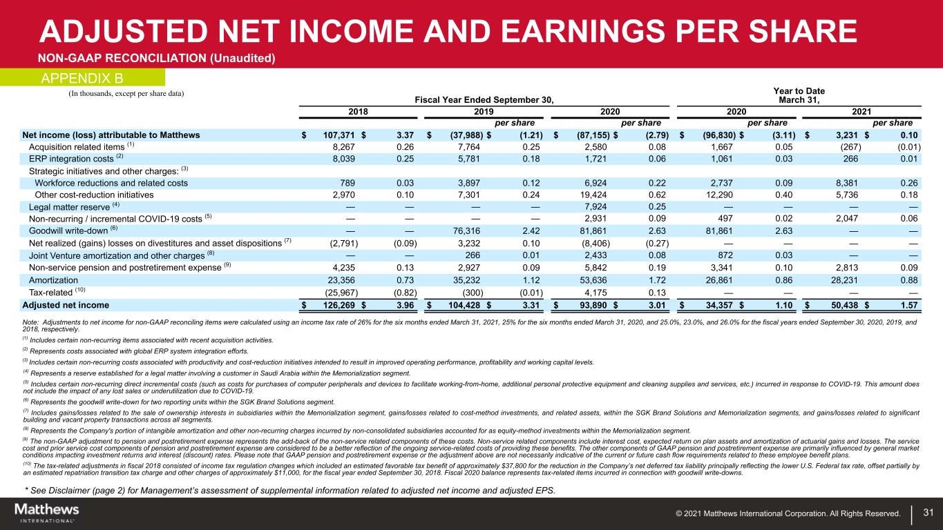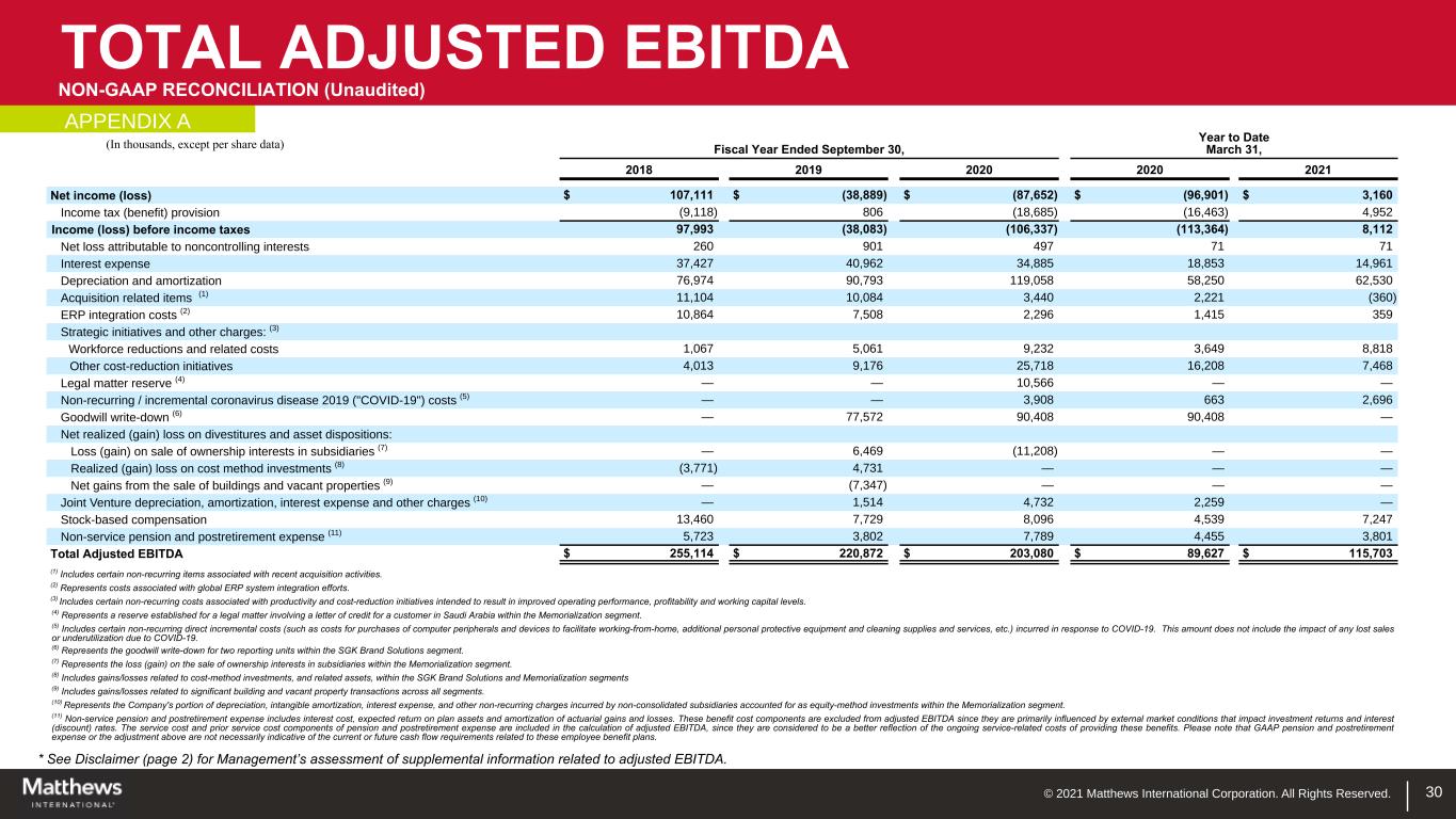 © 2021 Matthews International Corporation. All Rights Reserved. TOTAL ADJUSTED EBITDA NON-GAAP RECONCILIATION (Unaudited) * See Disclaimer (page 2) for Management’s assessment of supplemental information related to adjusted EBITDA. 30 (In thousands, except per share data) Fiscal Year Ended September 30, Year to Date March 31, 2018 2019 2020 2020 2021 Net income (loss) $ 107,111 $ (38,889) $ (87,652) $ (96,901) $ 3,160 Income tax (benefit) provision (9,118) 806 (18,685) (16,463) 4,952 Income (loss) before income taxes 97,993 (38,083) (106,337) (113,364) 8,112 Net loss attributable to noncontrolling interests 260 901 497 71 71 Interest expense 37,427 40,962 34,885 18,853 14,961 Depreciation and amortization 76,974 90,793 119,058 58,250 62,530 Acquisition related items (1) 11,104 10,084 3,440 2,221 (360) ERP integration costs (2) 10,864 7,508 2,296 1,415 359 Strategic initiatives and other charges: (3) Workforce reductions and related costs 1,067 5,061 9,232 3,649 8,818 Other cost-reduction initiatives 4,013 9,176 25,718 16,208 7,468 Legal matter reserve (4) — — 10,566 — — Non-recurring / incremental coronavirus disease 2019 ("COVID-19") costs (5) — — 3,908 663 2,696 Goodwill write-down (6) — 77,572 90,408 90,408 — Net realized (gain) loss on divestitures and asset dispositions: Loss (gain) on sale of ownership interests in subsidiaries (7) — 6,469 (11,208) — — Realized (gain) loss on cost method investments (8) (3,771) 4,731 — — — Net gains from the sale of buildings and vacant properties (9) — (7,347) — — — Joint Venture depreciation, amortization, interest expense and other charges (10) — 1,514 4,732 2,259 — Stock-based compensation 13,460 7,729 8,096 4,539 7,247 Non-service pension and postretirement expense (11) 5,723 3,802 7,789 4,455 3,801 Total Adjusted EBITDA $ 255,114 $ 220,872 $ 203,080 $ 89,627 $ 115,703 (1) Includes certain non-recurring items associated with recent acquisition activities. (2) Represents costs associated with global ERP system integration efforts. (3) Includes certain non-recurring costs associated with productivity and cost-reduction initiatives intended to result in improved operating performance, profitability and working capital levels. (4) Represents a reserve established for a legal matter involving a letter of credit for a customer in Saudi Arabia within the Memorialization segment. (5) Includes certain non-recurring direct incremental costs (such as costs for purchases of computer peripherals and devices to facilitate working-from-home, additional personal protective equipment and cleaning supplies and services, etc.) incurred in response to COVID-19. This amount does not include the impact of any lost sales or underutilization due to COVID-19. (6) Represents the goodwill write-down for two reporting units within the SGK Brand Solutions segment. (7) Represents the loss (gain) on the sale of ownership interests in subsidiaries within the Memorialization segment. (8) Includes gains/losses related to cost-method investments, and related assets, within the SGK Brand Solutions and Memorialization segments (9) Includes gains/losses related to significant building and vacant property transactions across all segments. (10) Represents the Company's portion of depreciation, intangible amortization, interest expense, and other non-recurring charges incurred by non-consolidated subsidiaries accounted for as equity-method investments within the Memorialization segment. (11) Non-service pension and postretirement expense includes interest cost, expected return on plan assets and amortization of actuarial gains and losses. These benefit cost components are excluded from adjusted EBITDA since they are primarily influenced by external market conditions that impact investment returns and interest (discount) rates. The service cost and prior service cost components of pension and postretirement expense are included in the calculation of adjusted EBITDA, since they are considered to be a better reflection of the ongoing service-related costs of providing these benefits. Please note that GAAP pension and postretirement expense or the adjustment above are not necessarily indicative of the current or future cash flow requirements related to these employee benefit plans. APPENDIX A