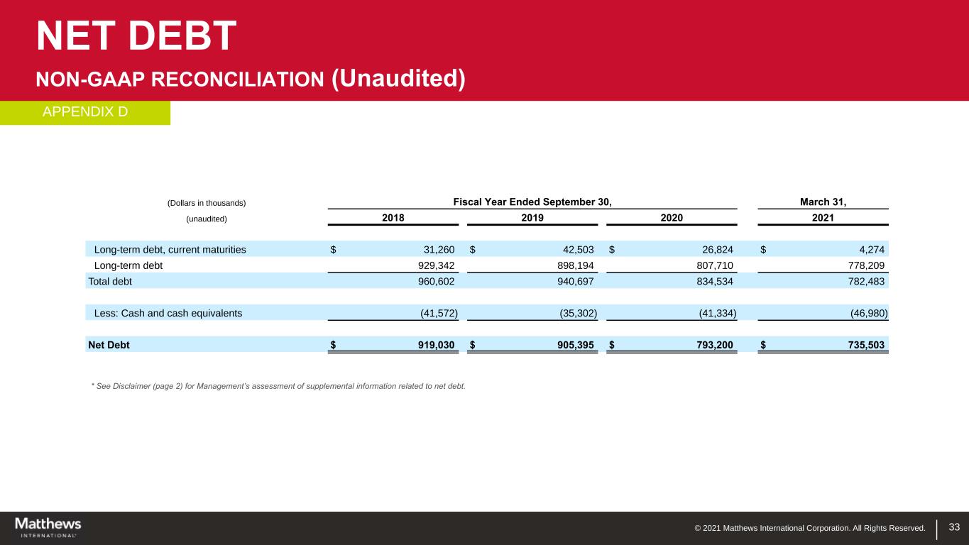 © 2021 Matthews International Corporation. All Rights Reserved. * See Disclaimer (page 2) for Management’s assessment of supplemental information related to net debt. 33 (Dollars in thousands) Fiscal Year Ended September 30, March 31, (unaudited) 2018 2019 2020 2021 Long-term debt, current maturities $ 31,260 $ 42,503 $ 26,824 $ 4,274 Long-term debt 929,342 898,194 807,710 778,209 Total debt 960,602 940,697 834,534 782,483 Less: Cash and cash equivalents (41,572) (35,302) (41,334) (46,980) Net Debt $ 919,030 $ 905,395 $ 793,200 $ 735,503 NET DEBT NON-GAAP RECONCILIATION (Unaudited) APPENDIX D