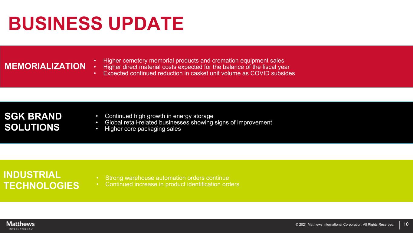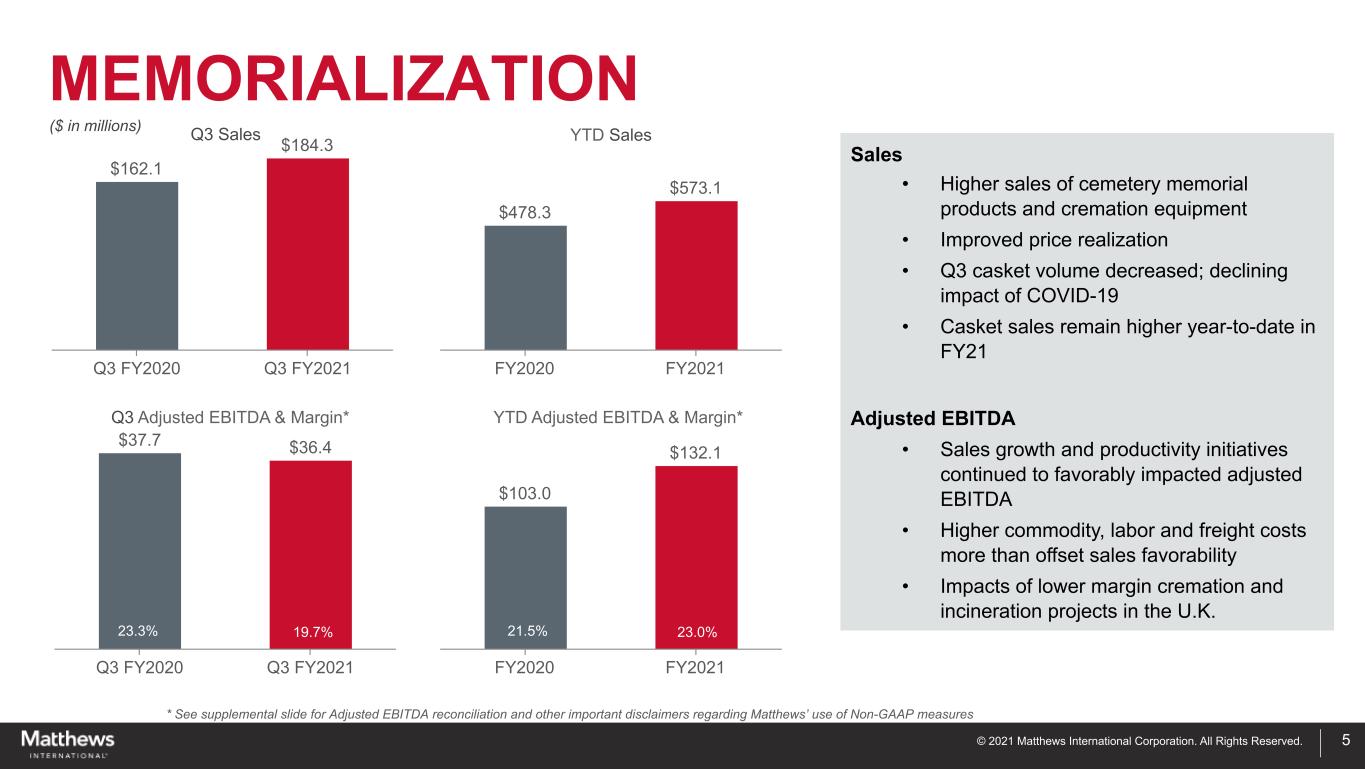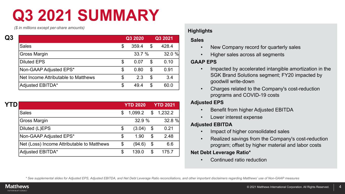 © 2021 Matthews International Corporation. All Rights Reserved. DISCLAIMER 2 Any forward-looking statements contained in this presentation are included pursuant to the “safe harbor” provisions of the Private Securities Litigation Reform Act of 1995. Such forward-looking statements involve known and unknown risks and uncertainties that may cause the Company’s actual results in future periods to be materially different from management’s expectations. Although the Company believes that the expectations reflected in such forward-looking statements are reasonable, no assurance can be given that such expectations will prove correct. Factors that could cause the Company's results to differ materially from the results discussed in such forward- looking statements principally include changes in domestic or international economic conditions, changes in foreign currency exchange rates, changes in the cost of materials used in the manufacture of the Company's products, changes in mortality and cremation rates, changes in product demand or pricing as a result of consolidation in the industries in which the Company operates, changes in product demand or pricing as a result of domestic or international competitive pressures, ability to achieve cost-reduction objectives, unknown risks in connection with the Company's acquisitions, cybersecurity concerns, effectiveness of the Company's internal controls, compliance with domestic and foreign laws and regulations, technological factors beyond the Company's control, impact of pandemics or similar outbreaks, such as coronavirus disease 2019 ("COVID-19") or other disruptions to our industries, customers or supply chains, and other factors described in the Company’s Annual Report on Form 10-K and other periodic filings with the U.S. Securities and Exchange Commission (“SEC”). Included in this report are measures of financial performance that are not defined by generally accepted accounting principles in the United States (“GAAP”). The Company uses non-GAAP financial measures to assist in comparing its performance on a consistent basis for purposes of business decision-making by removing the impact of certain items that management believes do not directly reflect the Company’s core operations including acquisition costs, ERP integration costs, strategic initiative and other charges (which includes non-recurring charges related to operational initiatives and exit activities), stock-based compensation and the non-service portion of pension and postretirement expense. Management believes that presenting non-GAAP financial measures is useful to investors because it (i) provides investors with meaningful supplemental information regarding financial performance by excluding certain items that management believes do not directly reflect the Company’s core operations, (ii) permits investors to view performance using the same tools that management uses to budget, forecast, make operating and strategic decisions, and evaluate historical performance, and (iii) otherwise provides supplemental information that may be useful to investors in evaluating the Company’s results. The Company believes that the presentation of these non-GAAP financial measures, when considered together with the corresponding GAAP financial measures and the reconciliations to those measures, provided herein, provides investors with an additional understanding of the factors and trends affecting the Company’s business that could not be obtained absent these disclosures. The Company believes that adjusted EBITDA provides relevant and useful information, which is used by the Company’s management in assessing the performance of its business. Adjusted EBITDA is defined by the Company as earnings before interest, income taxes, depreciation, amortization and certain non-cash and/or non-recurring items that do not contribute directly to management’s evaluation of its operating results. These items include stock- based compensation, the non-service portion of pension and postretirement expense, acquisition costs, ERP integration costs, and strategic initiatives and other charges. Adjusted EBITDA provides the Company with an understanding of earnings before the impact of investing and financing charges and income taxes, and the effects of certain acquisition and ERP integration costs, and items that do not reflect the ordinary earnings of the Company’s operations. This measure may be useful to an investor in evaluating operating performance. It is also useful as a financial measure for lenders and is used by the Company’s management to measure business performance. Adjusted EBITDA is not a measure of the Company's financial performance under GAAP and should not be considered as an alternative to net income or other performance measures derived in accordance with GAAP, or as an alternative to cash flow from operating activities as a measure of the Company's liquidity. The Company's definition of adjusted EBITDA may not be comparable to similarly titled measures used by other companies. The Company has also presented adjusted net income and adjusted earnings per share and believes each measure provides relevant and useful information, which is widely used by analysts and investors, as well as by the Company’s management in assessing the performance of its business. Adjusted net income and adjusted earnings per share provides the Company with an understanding of the results from the primary operations of our business by excluding the effects of certain acquisition and system-integration costs, and items that do not reflect the ordinary earnings of our operations. These measures provide management with insight into the earning value for shareholders excluding certain costs, not related to the Company’s primary operations. Likewise, these measures may be useful to an investor in evaluating the underlying operating performance of the Company’s business overall, as well as per