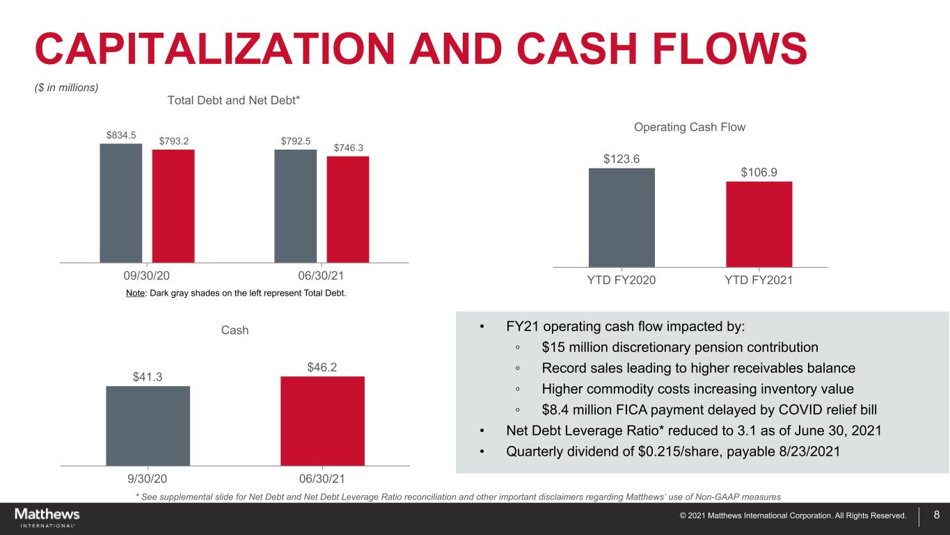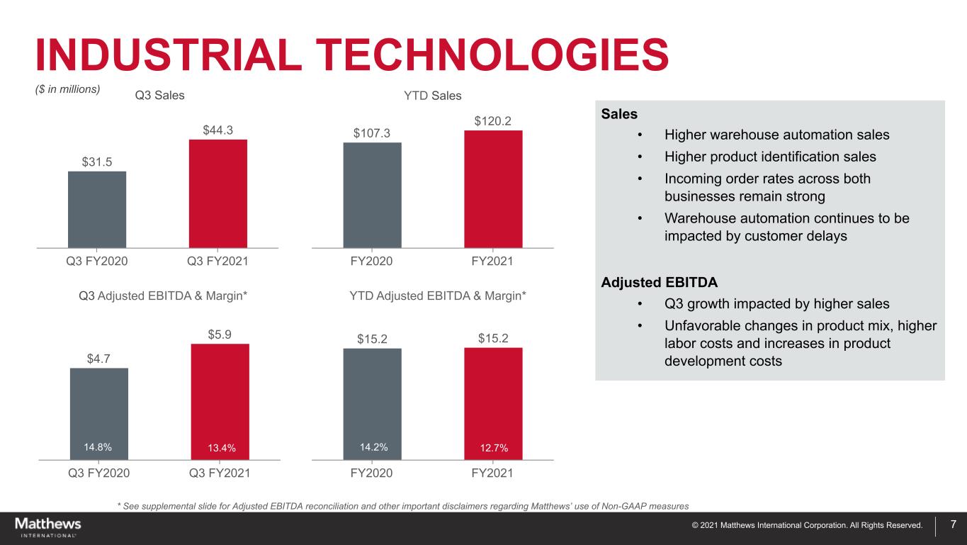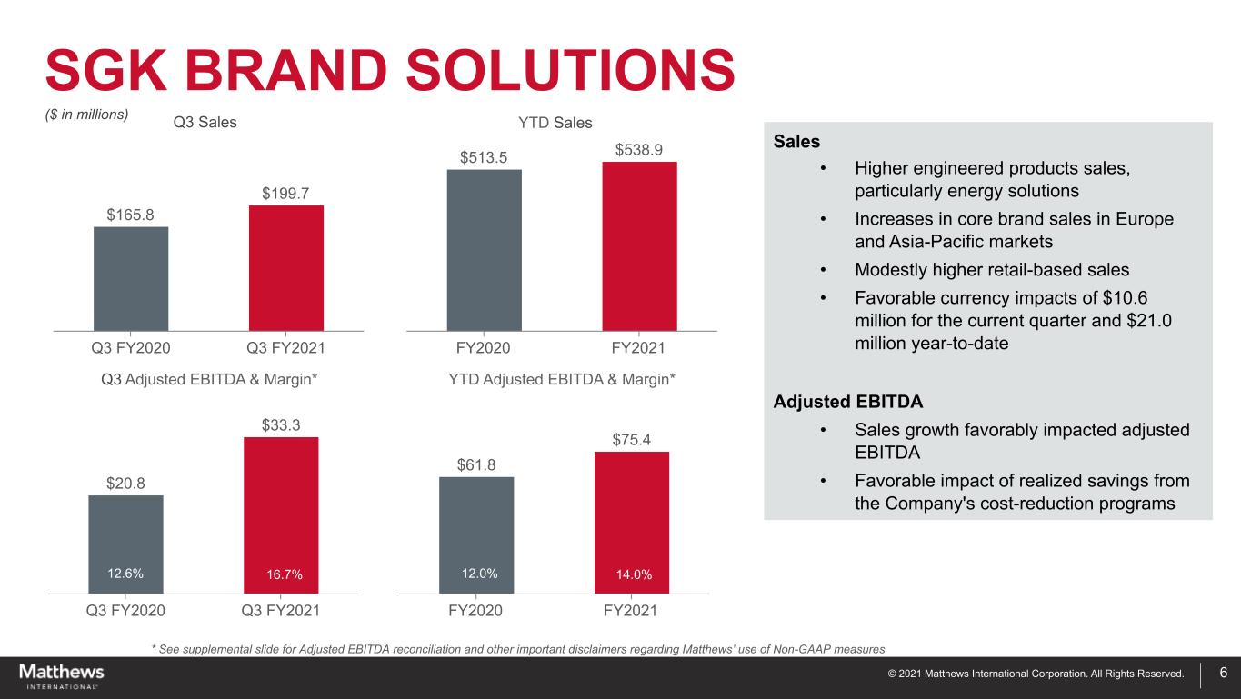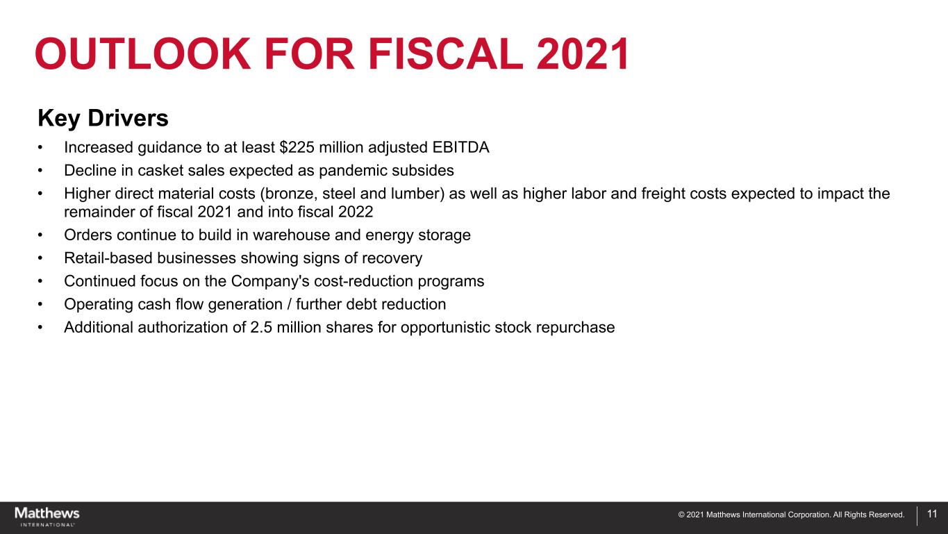 © 2021 Matthews International Corporation. All Rights Reserved. DISCLAIMER 2 Any forward-looking statements contained in this presentation are included pursuant to the “safe harbor” provisions of the Private Securities Litigation Reform Act of 1995. Such forward-looking statements involve known and unknown risks and uncertainties that may cause the Company’s actual results in future periods to be materially different from management’s expectations. Although the Company believes that the expectations reflected in such forward-looking statements are reasonable, no assurance can be given that such expectations will prove correct. Factors that could cause the Company's results to differ materially from the results discussed in such forward- looking statements principally include changes in domestic or international economic conditions, changes in foreign currency exchange rates, changes in the cost of materials used in the manufacture of the Company's products, changes in mortality and cremation rates, changes in product demand or pricing as a result of consolidation in the industries in which the Company operates, changes in product demand or pricing as a result of domestic or international competitive pressures, ability to achieve cost-reduction objectives, unknown risks in connection with the Company's acquisitions, cybersecurity concerns, effectiveness of the Company's internal controls, compliance with domestic and foreign laws and regulations, technological factors beyond the Company's control, impact of pandemics or similar outbreaks, such as coronavirus disease 2019 ("COVID-19") or other disruptions to our industries, customers or supply chains, and other factors described in the Company’s Annual Report on Form 10-K and other periodic filings with the U.S. Securities and Exchange Commission (“SEC”). Included in this report are measures of financial performance that are not defined by generally accepted accounting principles in the United States (“GAAP”). The Company uses non-GAAP financial measures to assist in comparing its performance on a consistent basis for purposes of business decision-making by removing the impact of certain items that management believes do not directly reflect the Company’s core operations including acquisition costs, ERP integration costs, strategic initiative and other charges (which includes non-recurring charges related to operational initiatives and exit activities), stock-based compensation and the non-service portion of pension and postretirement expense. Management believes that presenting non-GAAP financial measures is useful to investors because it (i) provides investors with meaningful supplemental information regarding financial performance by excluding certain items that management believes do not directly reflect the Company’s core operations, (ii) permits investors to view performance using the same tools that management uses to budget, forecast, make operating and strategic decisions, and evaluate historical performance, and (iii) otherwise provides supplemental information that may be useful to investors in evaluating the Company’s results. The Company believes that the presentation of these non-GAAP financial measures, when considered together with the corresponding GAAP financial measures and the reconciliations to those measures, provided herein, provides investors with an additional understanding of the factors and trends affecting the Company’s business that could not be obtained absent these disclosures. The Company believes that adjusted EBITDA provides relevant and useful information, which is used by the Company’s management in assessing the performance of its business. Adjusted EBITDA is defined by the Company as earnings before interest, income taxes, depreciation, amortization and certain non-cash and/or non-recurring items that do not contribute directly to management’s evaluation of its operating results. These items include stock- based compensation, the non-service portion of pension and postretirement expense, acquisition costs, ERP integration costs, and strategic initiatives and other charges. Adjusted EBITDA provides the Company with an understanding of earnings before the impact of investing and financing charges and income taxes, and the effects of certain acquisition and ERP integration costs, and items that do not reflect the ordinary earnings of the Company’s operations. This measure may be useful to an investor in evaluating operating performance. It is also useful as a financial measure for lenders and is used by the Company’s management to measure business performance. Adjusted EBITDA is not a measure of the Company's financial performance under GAAP and should not be considered as an alternative to net income or other performance measures derived in accordance with GAAP, or as an alternative to cash flow from operating activities as a measure of the Company's liquidity. The Company's definition of adjusted EBITDA may not be comparable to similarly titled measures used by other companies. The Company has also presented adjusted net income and adjusted earnings per share and believes each measure provides relevant and useful information, which is widely used by analysts and investors, as well as by the Company’s management in assessing the performance of its business. Adjusted net income and adjusted earnings per share provides the Company with an understanding of the results from the primary operations of our business by excluding the effects of certain acquisition and system-integration costs, and items that do not reflect the ordinary earnings of our operations. These measures provide management with insight into the earning value for shareholders excluding certain costs, not related to the Company’s primary operations. Likewise, these measures may be useful to an investor in evaluating the underlying operating performance of the Company’s business overall, as well as per