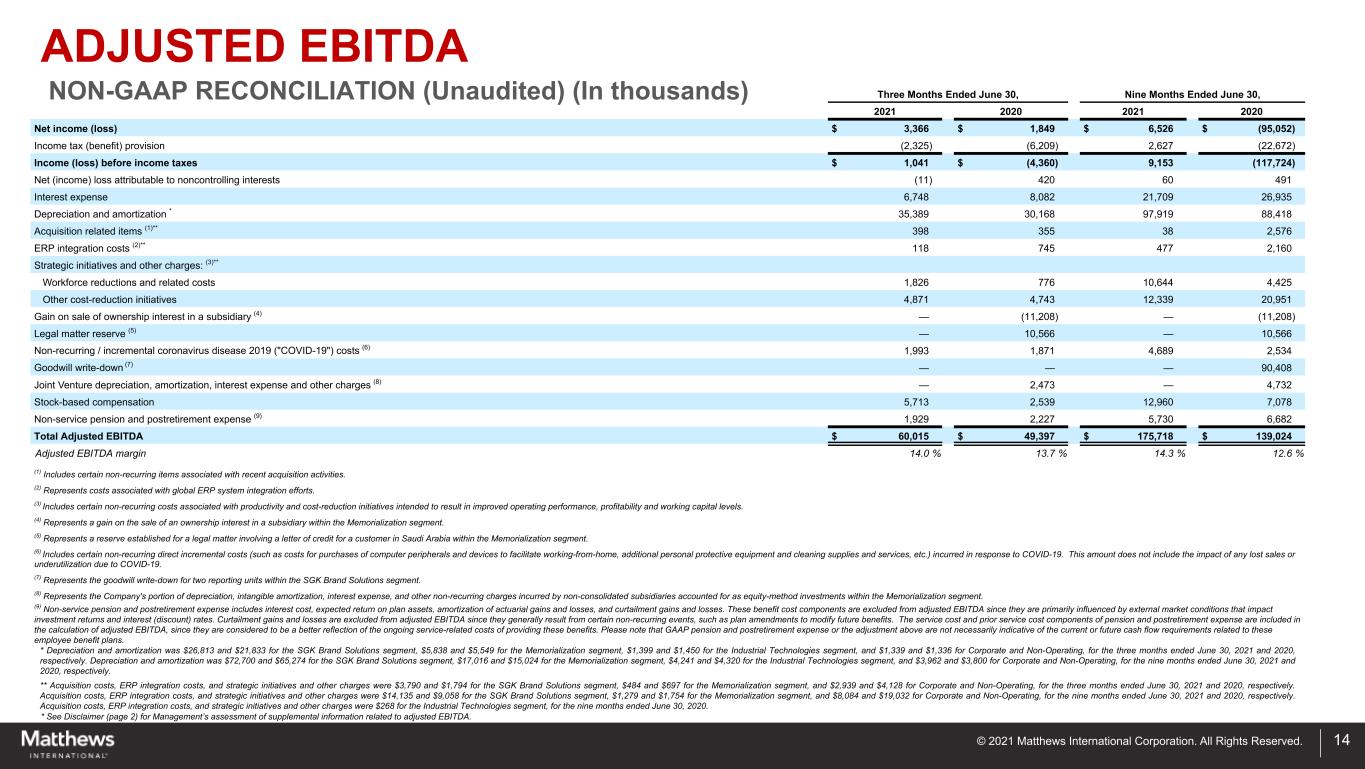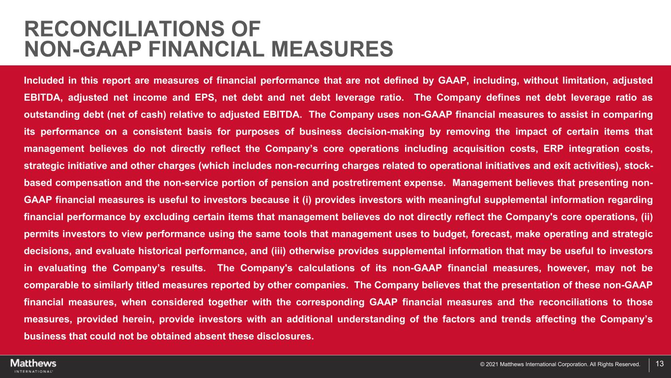 © 2021 Matthews International Corporation. All Rights Reserved. 13 Included in this report are measures of financial performance that are not defined by GAAP, including, without limitation, adjusted EBITDA, adjusted net income and EPS, net debt and net debt leverage ratio. The Company defines net debt leverage ratio as outstanding debt (net of cash) relative to adjusted EBITDA. The Company uses non-GAAP financial measures to assist in comparing its performance on a consistent basis for purposes of business decision-making by removing the impact of certain items that management believes do not directly reflect the Company’s core operations including acquisition costs, ERP integration costs, strategic initiative and other charges (which includes non-recurring charges related to operational initiatives and exit activities), stock- based compensation and the non-service portion of pension and postretirement expense. Management believes that presenting non- GAAP financial measures is useful to investors because it (i) provides investors with meaningful supplemental information regarding financial performance by excluding certain items that management believes do not directly reflect the Company's core operations, (ii) permits investors to view performance using the same tools that management uses to budget, forecast, make operating and strategic decisions, and evaluate historical performance, and (iii) otherwise provides supplemental information that may be useful to investors in evaluating the Company’s results. The Company's calculations of its non-GAAP financial measures, however, may not be comparable to similarly titled measures reported by other companies. The Company believes that the presentation of these non-GAAP financial measures, when considered together with the corresponding GAAP financial measures and the reconciliations to those measures, provided herein, provide investors with an additional understanding of the factors and trends affecting the Company’s business that could not be obtained absent these disclosures. RECONCILIATIONS OF NON-GAAP FINANCIAL MEASURES