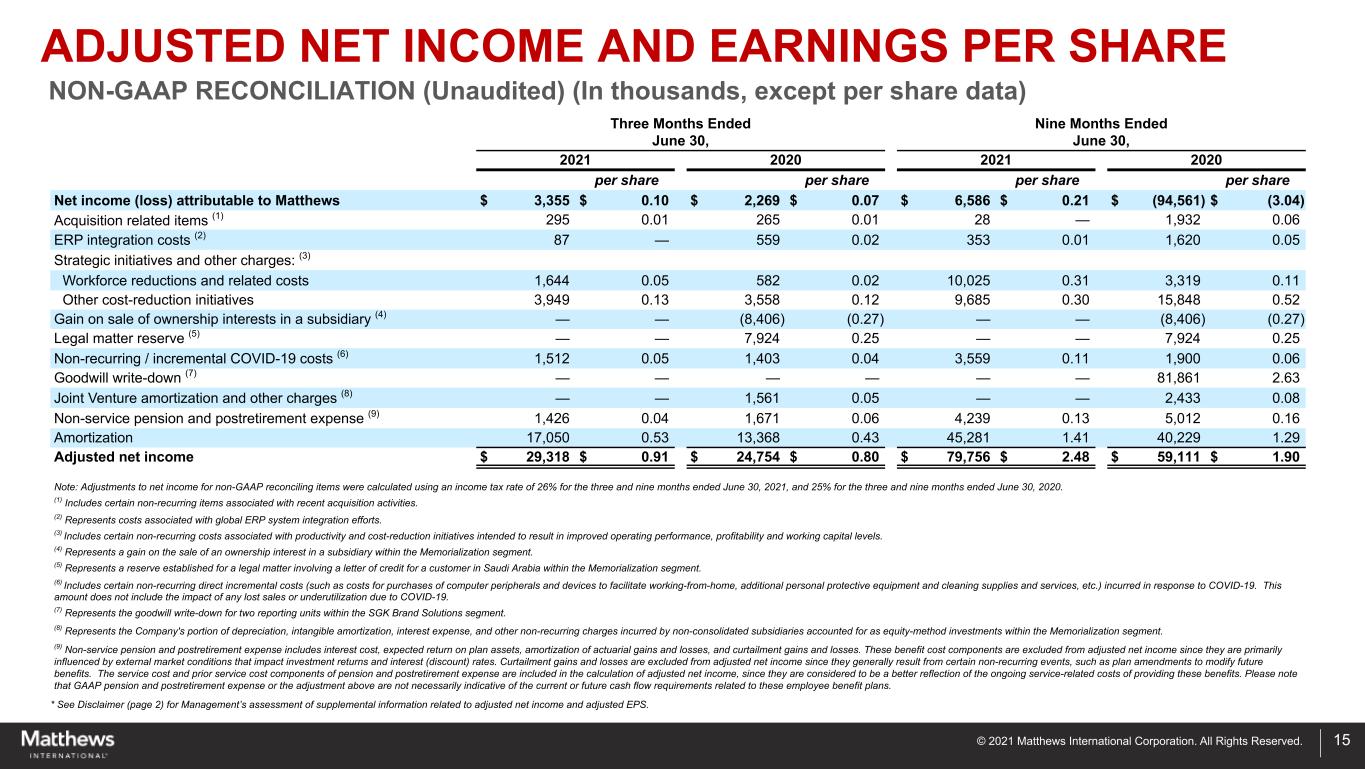 © 2021 Matthews International Corporation. All Rights Reserved. * See Disclaimer (page 2) for Management’s assessment of supplemental information related to adjusted EBITDA. 14 Three Months Ended June 30, Nine Months Ended June 30, 2021 2020 2021 2020 Net income (loss) $ 3,366 $ 1,849 $ 6,526 $ (95,052) Income tax (benefit) provision (2,325) (6,209) 2,627 (22,672) Income (loss) before income taxes $ 1,041 $ (4,360) 9,153 (117,724) Net (income) loss attributable to noncontrolling interests (11) 420 60 491 Interest expense 6,748 8,082 21,709 26,935 Depreciation and amortization * 35,389 30,168 97,919 88,418 Acquisition related items (1)** 398 355 38 2,576 ERP integration costs (2)** 118 745 477 2,160 Strategic initiatives and other charges: (3)** Workforce reductions and related costs 1,826 776 10,644 4,425 Other cost-reduction initiatives 4,871 4,743 12,339 20,951 Gain on sale of ownership interest in a subsidiary (4) — (11,208) — (11,208) Legal matter reserve (5) — 10,566 — 10,566 Non-recurring / incremental coronavirus disease 2019 ("COVID-19") costs (6) 1,993 1,871 4,689 2,534 Goodwill write-down (7) — — — 90,408 Joint Venture depreciation, amortization, interest expense and other charges (8) — 2,473 — 4,732 Stock-based compensation 5,713 2,539 12,960 7,078 Non-service pension and postretirement expense (9) 1,929 2,227 5,730 6,682 Total Adjusted EBITDA $ 60,015 $ 49,397 $ 175,718 $ 139,024 Adjusted EBITDA margin 14.0 % 13.7 % 14.3 % 12.6 % (1) Includes certain non-recurring items associated with recent acquisition activities. (2) Represents costs associated with global ERP system integration efforts. (3) Includes certain non-recurring costs associated with productivity and cost-reduction initiatives intended to result in improved operating performance, profitability and working capital levels. (4) Represents a gain on the sale of an ownership interest in a subsidiary within the Memorialization segment. (5) Represents a reserve established for a legal matter involving a letter of credit for a customer in Saudi Arabia within the Memorialization segment. (6) Includes certain non-recurring direct incremental costs (such as costs for purchases of computer peripherals and devices to facilitate working-from-home, additional personal protective equipment and cleaning supplies and services, etc.) incurred in response to COVID-19. This amount does not include the impact of any lost sales or underutilization due to COVID-19. (7) Represents the goodwill write-down for two reporting units within the SGK Brand Solutions segment. (8) Represents the Company's portion of depreciation, intangible amortization, interest expense, and other non-recurring charges incurred by non-consolidated subsidiaries accounted for as equity-method investments within the Memorialization segment. (9) Non-service pension and postretirement expense includes interest cost, expected return on plan assets, amortization of actuarial gains and losses, and curtailment gains and losses. These benefit cost components are excluded from adjusted EBITDA since they are primarily influenced by external market conditions that impact investment returns and interest (discount) rates. Curtailment gains and losses are excluded from adjusted EBITDA since they generally result from certain non-recurring events, such as plan amendments to modify future benefits. The service cost and prior service cost components of pension and postretirement expense are included in the calculation of adjusted EBITDA, since they are considered to be a better reflection of the ongoing service-related costs of providing these benefits. Please note that GAAP pension and postretirement expense or the adjustment above are not necessarily indicative of the current or future cash flow requirements related to these employee benefit plans. * Depreciation and amortization was $26,813 and $21,833 for the SGK Brand Solutions segment, $5,838 and $5,549 for the Memorialization segment, $1,399 and $1,450 for the Industrial Technologies segment, and $1,339 and $1,336 for Corporate and Non-Operating, for the three months ended June 30, 2021 and 2020, respectively. Depreciation and amortization was $72,700 and $65,274 for the SGK Brand Solutions segment, $17,016 and $15,024 for the Memorialization segment, $4,241 and $4,320 for the Industrial Technologies segment, and $3,962 and $3,800 for Corporate and Non-Operating, for the nine months ended June 30, 2021 and 2020, respectively. ** Acquisition costs, ERP integration costs, and strategic initiatives and other charges were $3,790 and $1,794 for the SGK Brand Solutions segment, $484 and $697 for the Memorialization segment, and $2,939 and $4,128 for Corporate and Non-Operating, for the three months ended June 30, 2021 and 2020, respectively. Acquisition costs, ERP integration costs, and strategic initiatives and other charges were $14,135 and $9,058 for the SGK Brand Solutions segment, $1,279 and $1,754 for the Memorialization segment, and $8,084 and $19,032 for Corporate and Non-Operating, for the nine months ended June 30, 2021 and 2020, respectively. Acquisition costs, ERP integration costs, and strategic initiatives and other charges were $268 for the Industrial Technologies segment, for the nine months ended June 30, 2020. ADJUSTED EBITDA NON-GAAP RECONCILIATION (Unaudited) (In thousands)