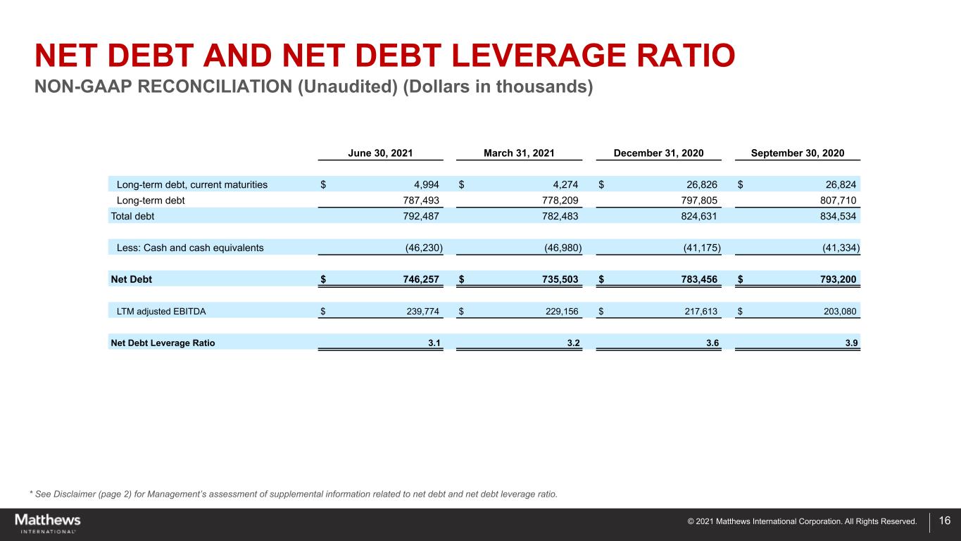 © 2021 Matthews International Corporation. All Rights Reserved. ADJUSTED NET INCOME AND EARNINGS PER SHARE NON-GAAP RECONCILIATION (Unaudited) (In thousands, except per share data) * See Disclaimer (page 2) for Management’s assessment of supplemental information related to adjusted net income and adjusted EPS. 15 Three Months Ended June 30, Nine Months Ended June 30, 2021 2020 2021 2020 per share per share per share per share Net income (loss) attributable to Matthews $ 3,355 $ 0.10 $ 2,269 $ 0.07 $ 6,586 $ 0.21 $ (94,561) $ (3.04) Acquisition related items (1) 295 0.01 265 0.01 28 — 1,932 0.06 ERP integration costs (2) 87 — 559 0.02 353 0.01 1,620 0.05 Strategic initiatives and other charges: (3) Workforce reductions and related costs 1,644 0.05 582 0.02 10,025 0.31 3,319 0.11 Other cost-reduction initiatives 3,949 0.13 3,558 0.12 9,685 0.30 15,848 0.52 Gain on sale of ownership interests in a subsidiary (4) — — (8,406) (0.27) — — (8,406) (0.27) Legal matter reserve (5) — — 7,924 0.25 — — 7,924 0.25 Non-recurring / incremental COVID-19 costs (6) 1,512 0.05 1,403 0.04 3,559 0.11 1,900 0.06 Goodwill write-down (7) — — — — — — 81,861 2.63 Joint Venture amortization and other charges (8) — — 1,561 0.05 — — 2,433 0.08 Non-service pension and postretirement expense (9) 1,426 0.04 1,671 0.06 4,239 0.13 5,012 0.16 Amortization 17,050 0.53 13,368 0.43 45,281 1.41 40,229 1.29 Adjusted net income $ 29,318 $ 0.91 $ 24,754 $ 0.80 $ 79,756 $ 2.48 $ 59,111 $ 1.90 Note: Adjustments to net income for non-GAAP reconciling items were calculated using an income tax rate of 26% for the three and nine months ended June 30, 2021, and 25% for the three and nine months ended June 30, 2020. (1) Includes certain non-recurring items associated with recent acquisition activities. (2) Represents costs associated with global ERP system integration efforts. (3) Includes certain non-recurring costs associated with productivity and cost-reduction initiatives intended to result in improved operating performance, profitability and working capital levels. (4) Represents a gain on the sale of an ownership interest in a subsidiary within the Memorialization segment. (5) Represents a reserve established for a legal matter involving a letter of credit for a customer in Saudi Arabia within the Memorialization segment. (6) Includes certain non-recurring direct incremental costs (such as costs for purchases of computer peripherals and devices to facilitate working-from-home, additional personal protective equipment and cleaning supplies and services, etc.) incurred in response to COVID-19. This amount does not include the impact of any lost sales or underutilization due to COVID-19. (7) Represents the goodwill write-down for two reporting units within the SGK Brand Solutions segment. (8) Represents the Company's portion of depreciation, intangible amortization, interest expense, and other non-recurring charges incurred by non-consolidated subsidiaries accounted for as equity-method investments within the Memorialization segment. (9) Non-service pension and postretirement expense includes interest cost, expected return on plan assets, amortization of actuarial gains and losses, and curtailment gains and losses. These benefit cost components are excluded from adjusted net income since they are primarily influenced by external market conditions that impact investment returns and interest (discount) rates. Curtailment gains and losses are excluded from adjusted net income since they generally result from certain non-recurring events, such as plan amendments to modify future benefits. The service cost and prior service cost components of pension and postretirement expense are included in the calculation of adjusted net income, since they are considered to be a better reflection of the ongoing service-related costs of providing these benefits. Please note that GAAP pension and postretirement expense or the adjustment above are not necessarily indicative of the current or future cash flow requirements related to these employee benefit plans.