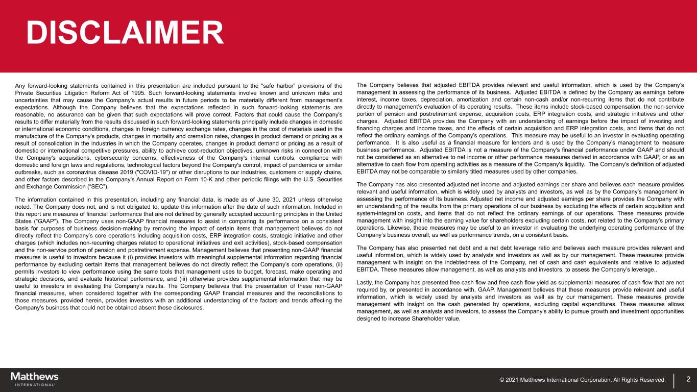 © 2021 Matthews International Corporation. All Rights Reserved. 2 DISCLAIMER Any forward-looking statements contained in this presentation are included pursuant to the “safe harbor” provisions of the Private Securities Litigation Reform Act of 1995. Such forward-looking statements involve known and unknown risks and uncertainties that may cause the Company’s actual results in future periods to be materially different from management’s expectations. Although the Company believes that the expectations reflected in such forward-looking statements are reasonable, no assurance can be given that such expectations will prove correct. Factors that could cause the Company's results to differ materially from the results discussed in such forward-looking statements principally include changes in domestic or international economic conditions, changes in foreign currency exchange rates, changes in the cost of materials used in the manufacture of the Company's products, changes in mortality and cremation rates, changes in product demand or pricing as a result of consolidation in the industries in which the Company operates, changes in product demand or pricing as a result of domestic or international competitive pressures, ability to achieve cost-reduction objectives, unknown risks in connection with the Company's acquisitions, cybersecurity concerns, effectiveness of the Company's internal controls, compliance with domestic and foreign laws and regulations, technological factors beyond the Company's control, impact of pandemics or similar outbreaks, such as coronavirus disease 2019 ("COVID-19") or other disruptions to our industries, customers or supply chains, and other factors described in the Company’s Annual Report on Form 10-K and other periodic filings with the U.S. Securities and Exchange Commission (“SEC”). The information contained in this presentation, including any financial data, is made as of June 30, 2021 unless otherwise noted. The Company does not, and is not obligated to, update this information after the date of such information. Included in this report are measures of financial performance that are not defined by generally accepted accounting principles in the United States (“GAAP”). The Company uses non-GAAP financial measures to assist in comparing its performance on a consistent basis for purposes of business decision-making by removing the impact of certain items that management believes do not directly reflect the Company’s core operations including acquisition costs, ERP integration costs, strategic initiative and other charges (which includes non-recurring charges related to operational initiatives and exit activities), stock-based compensation and the non-service portion of pension and postretirement expense. Management believes that presenting non-GAAP financial measures is useful to investors because it (i) provides investors with meaningful supplemental information regarding financial performance by excluding certain items that management believes do not directly reflect the Company’s core operations, (ii) permits investors to view performance using the same tools that management uses to budget, forecast, make operating and strategic decisions, and evaluate historical performance, and (iii) otherwise provides supplemental information that may be useful to investors in evaluating the Company’s results. The Company believes that the presentation of these non-GAAP financial measures, when considered together with the corresponding GAAP financial measures and the reconciliations to those measures, provided herein, provides investors with an additional understanding of the factors and trends affecting the Company’s business that could not be obtained absent these disclosures. The Company believes that adjusted EBITDA provides relevant and useful information, which is used by the Company’s management in assessing the performance of its business. Adjusted EBITDA is defined by the Company as earnings before interest, income taxes, depreciation, amortization and certain non-cash and/or non-recurring items that do not contribute directly to management’s evaluation of its operating results. These items include stock-based compensation, the non-service portion of pension and postretirement expense, acquisition costs, ERP integration costs, and strategic initiatives and other charges. Adjusted EBITDA provides the Company with an understanding of earnings before the impact of investing and financing charges and income taxes, and the effects of certain acquisition and ERP integration costs, and items that do not reflect the ordinary earnings of the Company’s operations. This measure may be useful to an investor in evaluating operating performance. It is also useful as a financial measure for lenders and is used by the Company’s management to measure business performance. Adjusted EBITDA is not a measure of the Company's financial performance under GAAP and should not be considered as an alternative to net income or other performance measures derived in accordance with GAAP, or as an alternative to cash flow from operating activities as a measure of the Company's liquidity. The Company's definition of adjusted EBITDA may not be comparable to similarly titled measures used by other companies. The Company has also presented adjusted net income and adjusted earnings per share and believes each measure provides relevant and useful information, which is widely used by analysts and investors, as well as by the Company’s management in assessing the performance of its business. Adjusted net income and adjusted earnings per share provides the Company with an understanding of the results from the primary operations of our business by excluding the effects of certain acquisition and system-integration costs, and items that do not reflect the ordinary earnings of our operations. These measures provide management with insight into the earning value for shareholde