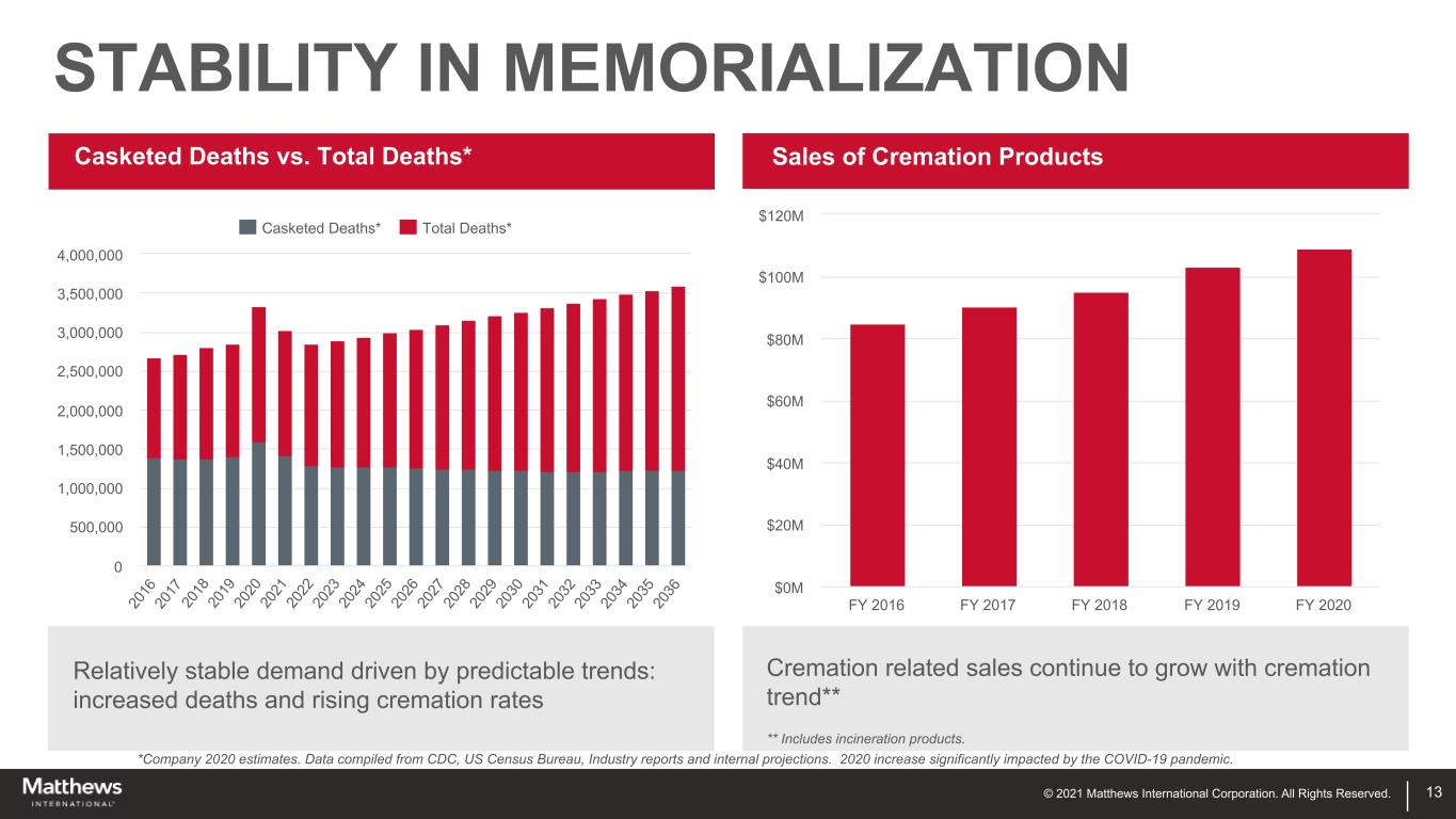 © 2021 Matthews International Corporation. All Rights Reserved. PRODUCTS Cemetery Products Bronze Memorials - #1 Granite Memorials - #1 North America, Italy, Australia 12 Funeral Home Products Caskets - #2 United States Cremation and Incineration Equipment Cremation Equipment - #1 Global Market Position (U.S.) Core Geographies