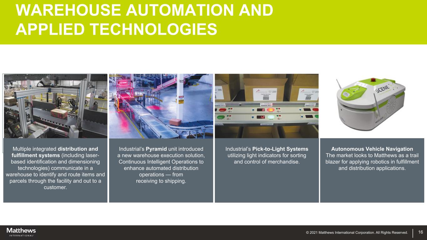© 2021 Matthews International Corporation. All Rights Reserved. Source: Technavio Report (May 2017) 15 PRODUCT IDENTIFICATION New Technology Improved Reliability + 75% lower cost of ownership + Reduced downtime Continuous Inkjet 46% Laser 15% Print & Apply 11% Drop on Demand 28% New Market Opportunity Limited Offering Matthews A Market Leader