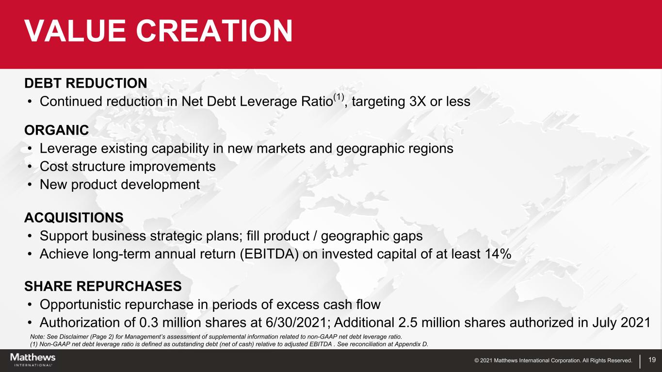 © 2021 Matthews International Corporation. All Rights Reserved. 19 DEBT REDUCTION • Continued reduction in Net Debt Leverage Ratio(1), targeting 3X or less ORGANIC • Leverage existing capability in new markets and geographic regions • Cost structure improvements • New product development ACQUISITIONS • Support business strategic plans; fill product / geographic gaps • Achieve long-term annual return (EBITDA) on invested capital of at least 14% SHARE REPURCHASES • Opportunistic repurchase in periods of excess cash flow • Authorization of 0.3 million shares at 6/30/2021; Additional 2.5 million shares authorized in July 2021 VALUE CREATION Note: See Disclaimer (Page 2) for Management’s assessment of supplemental information related to non-GAAP net debt leverage ratio. (1) Non-GAAP net debt leverage ratio is defined as outstanding debt (net of cash) relative to adjusted EBITDA . See reconciliation at Appendix D.