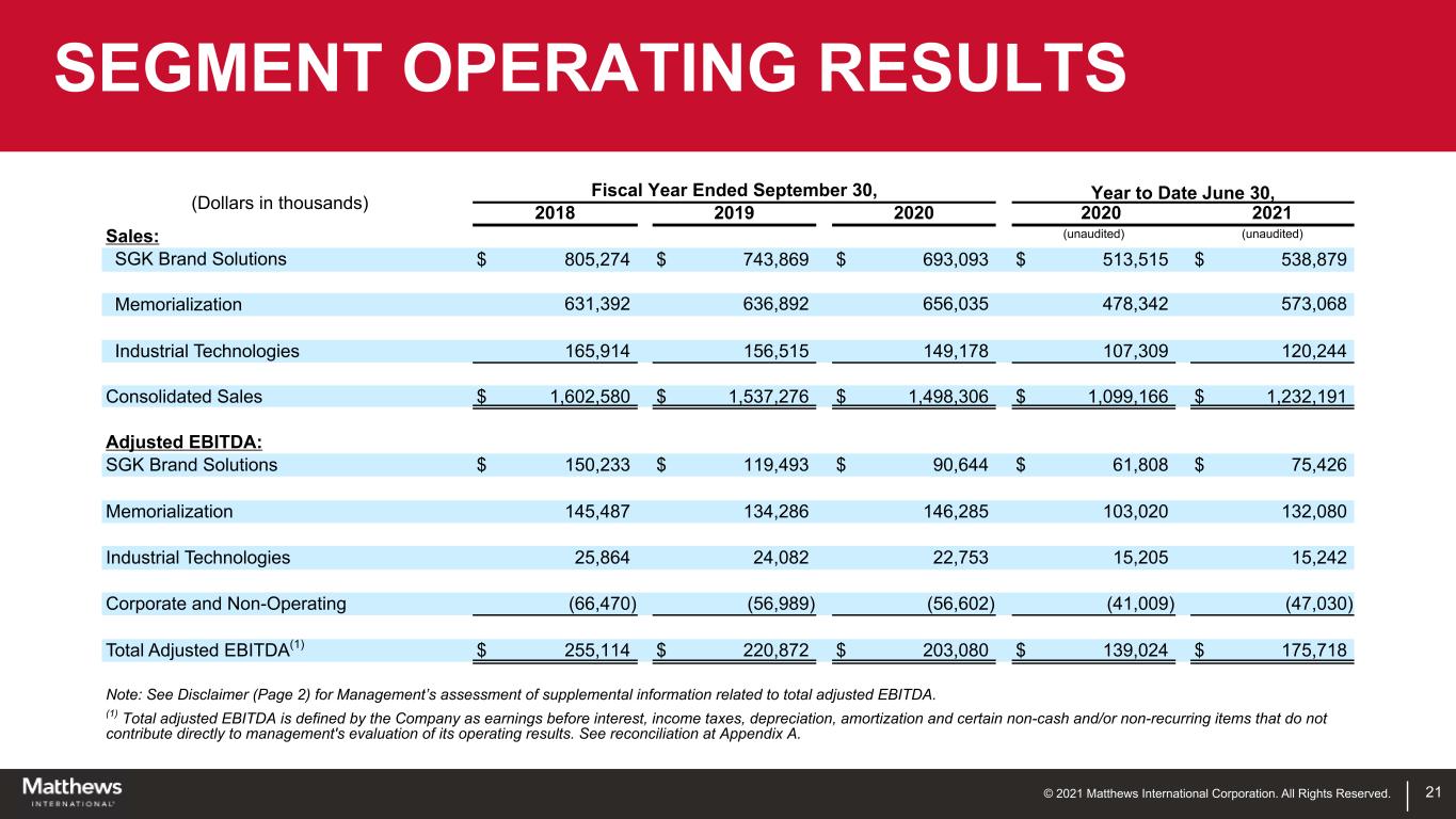 © 2021 Matthews International Corporation. All Rights Reserved. 20 CONSOLIDATED RESULTS (Dollars in thousands, except per share data) Fiscal Year Ended September 30, Year to Date June 30, 2018 2019 2020 2020 2021 (unaudited) (unaudited) Consolidated Sales $ 1,602,580 $ 1,537,276 $ 1,498,306 $ 1,099,166 $ 1,232,191 Net Income (Loss) Attributable to Matthews $ 107,371 $ (37,988) $ (87,155) $ (94,561) $ 6,586 Total Adjusted EBITDA(1) $ 255,114 $ 220,872 $ 203,080 $ 139,024 $ 175,718 Diluted E(L)PS $ 3.37 $ (1.21) $ (2.79) $ (3.04) $ 0.21 Non-GAAP Adjusted EPS(2) $ 3.96 $ 3.31 $ 3.01 $ 1.90 $ 2.48 Note: See Disclaimer (Page 2) for Management’s assessment of supplemental information related to total adjusted EBITDA and non-GAAP adjusted EPS. (1) Total adjusted EBITDA is defined by the Company as earnings before interest, income taxes, depreciation, amortization and certain non-cash and/or non-recurring items that do not contribute directly to management's evaluation of its operating results. See reconciliation at Appendix A. (2) Non-GAAP adjusted EPS reflects certain adjustments to facilitate comparability and excludes intangible amortization and the non-service cost portion of pension/post-retirement expense. See reconciliation at Appendix B.