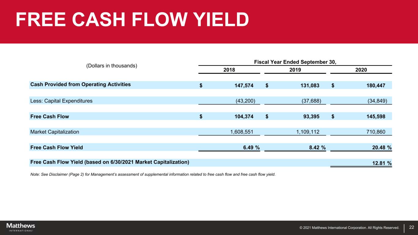 © 2021 Matthews International Corporation. All Rights Reserved. 21 SEGMENT OPERATING RESULTS (Dollars in thousands) Fiscal Year Ended September 30, Year to Date June 30, 2018 2019 2020 2020 2021 Sales: (unaudited) (unaudited) SGK Brand Solutions $ 805,274 $ 743,869 $ 693,093 $ 513,515 $ 538,879 Memorialization 631,392 636,892 656,035 478,342 573,068 Industrial Technologies 165,914 156,515 149,178 107,309 120,244 Consolidated Sales $ 1,602,580 $ 1,537,276 $ 1,498,306 $ 1,099,166 $ 1,232,191 Adjusted EBITDA: SGK Brand Solutions $ 150,233 $ 119,493 $ 90,644 $ 61,808 $ 75,426 Memorialization 145,487 134,286 146,285 103,020 132,080 Industrial Technologies 25,864 24,082 22,753 15,205 15,242 Corporate and Non-Operating (66,470) (56,989) (56,602) (41,009) (47,030) Total Adjusted EBITDA(1) $ 255,114 $ 220,872 $ 203,080 $ 139,024 $ 175,718 Note: See Disclaimer (Page 2) for Management’s assessment of supplemental information related to total adjusted EBITDA. (1) Total adjusted EBITDA is defined by the Company as earnings before interest, income taxes, depreciation, amortization and certain non-cash and/or non-recurring items that do not contribute directly to management's evaluation of its operating results. See reconciliation at Appendix A.