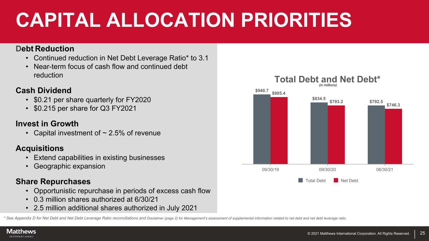 © 2021 Matthews International Corporation. All Rights Reserved. 24 SALES AND TOTAL ADJUSTED EBITDA Note: See Disclaimer (Page 2) for Management’s assessment of supplemental information related to total adjusted EBITDA. (1) Total adjusted EBITDA is defined by the Company as earnings before interest, income taxes, depreciation, amortization and certain non-cash and/or non-recurring items that do not contribute directly to management's evaluation of its operating results. See reconciliation at Appendix A. (1) (Dollars in millions) Consolidated Sales $1,480.5 $1,515.6 $1,602.6 $1,537.3 $1,498.3 2016 2017 2018 2019 2020 $0.0 $200.0 $400.0 $600.0 $800.0 $1,000.0 $1,200.0 $1,400.0 $1,600.0 $1,800.0 Total Adjusted EBITDA $239.6 $238.7 $255.1 $220.9 $203.1 2016 2017 2018 2019 2020 $0.0 $50.0 $100.0 $150.0 $200.0 $250.0 $300.0