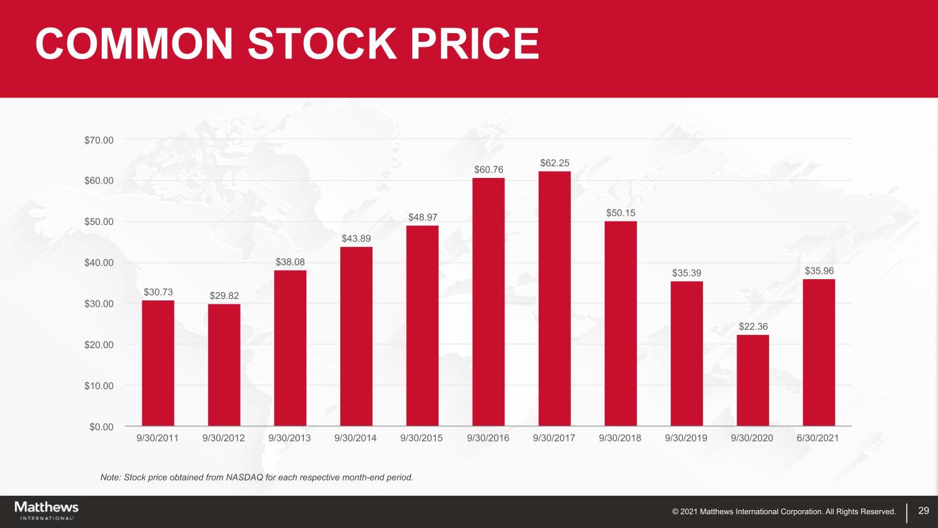 © 2021 Matthews International Corporation. All Rights Reserved. 29 COMMON STOCK PRICE Note: Stock price obtained from NASDAQ for each respective month-end period. $30.73 $29.82 $38.08 $43.89 $48.97 $60.76 $62.25 $50.15 $35.39 $22.36 $35.96 9/30/2011 9/30/2012 9/30/2013 9/30/2014 9/30/2015 9/30/2016 9/30/2017 9/30/2018 9/30/2019 9/30/2020 6/30/2021 $0.00 $10.00 $20.00 $30.00 $40.00 $50.00 $60.00 $70.00