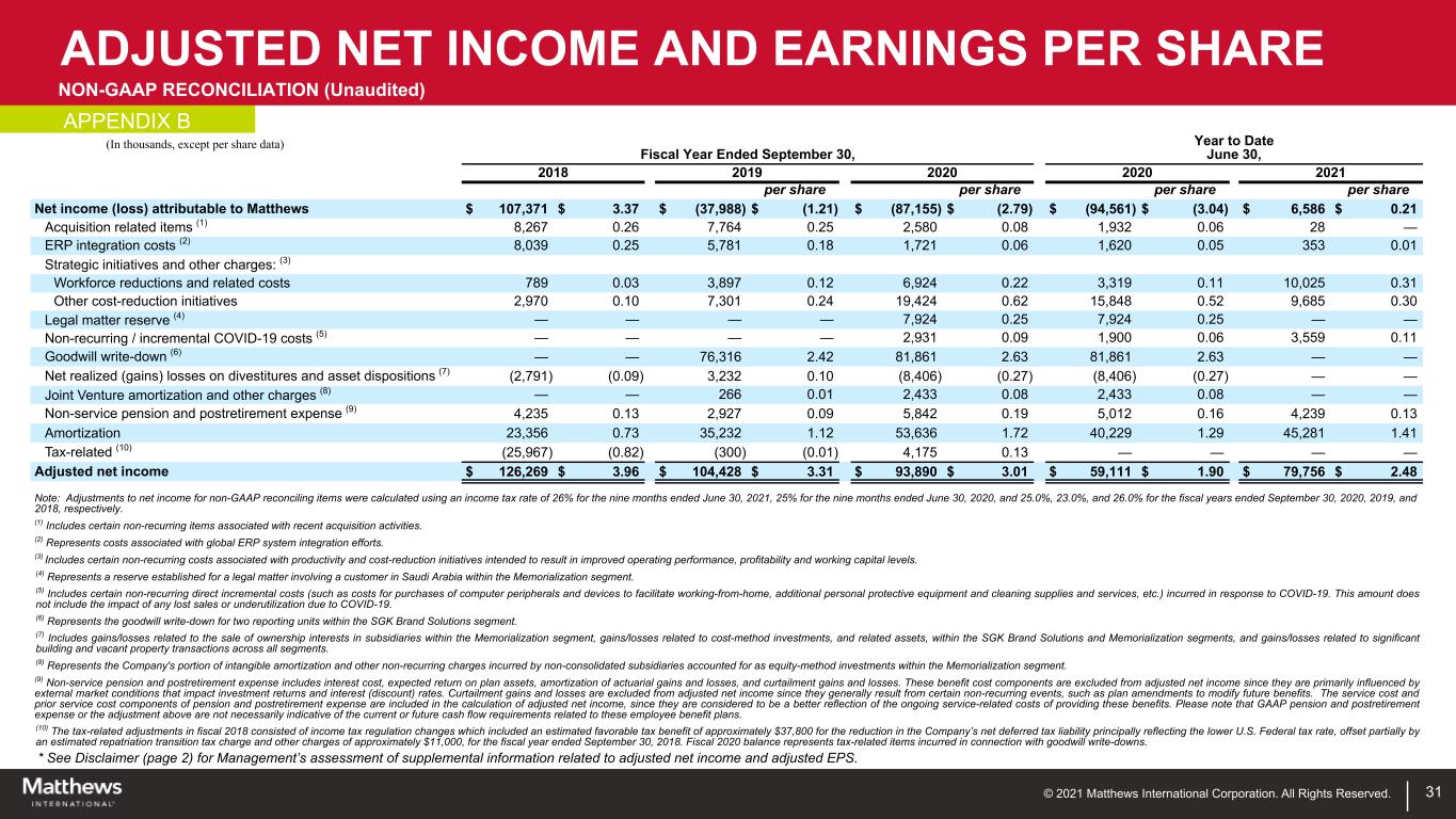 © 2021 Matthews International Corporation. All Rights Reserved. TOTAL ADJUSTED EBITDA NON-GAAP RECONCILIATION (Unaudited) * See Disclaimer (page 2) for Management’s assessment of supplemental information related to adjusted EBITDA. 30 (In thousands, except per share data) Fiscal Year Ended September 30, Year to Date June 30, 2018 2019 2020 2020 2021 Net income (loss) $ 107,111 $ (38,889) $ (87,652) $ (95,052) $ 6,526 Income tax (benefit) provision (9,118) 806 (18,685) (22,672) 2,627 Income (loss) before income taxes 97,993 (38,083) (106,337) (117,724) 9,153 Net loss attributable to noncontrolling interests 260 901 497 491 60 Interest expense 37,427 40,962 34,885 26,935 21,709 Depreciation and amortization 76,974 90,793 119,058 88,418 97,919 Acquisition related items (1) 11,104 10,084 3,440 2,576 38 ERP integration costs (2) 10,864 7,508 2,296 2,160 477 Strategic initiatives and other charges: (3) Workforce reductions and related costs 1,067 5,061 9,232 4,425 10,644 Other cost-reduction initiatives 4,013 9,176 25,718 20,951 12,339 Legal matter reserve (4) — — 10,566 10,566 — Non-recurring / incremental coronavirus disease 2019 ("COVID-19") costs (5) — — 3,908 2,534 4,689 Goodwill write-down (6) — 77,572 90,408 90,408 — Net realized (gain) loss on divestitures and asset dispositions: Loss (gain) on sale of ownership interests in subsidiaries (7) — 6,469 (11,208) (11,208) — Realized (gain) loss on cost method investments (8) (3,771) 4,731 — — — Net gains from the sale of buildings and vacant properties (9) — (7,347) — — — Joint Venture depreciation, amortization, interest expense and other charges (10) — 1,514 4,732 4,732 — Stock-based compensation 13,460 7,729 8,096 7,078 12,960 Non-service pension and postretirement expense (11) 5,723 3,802 7,789 6,682 5,730 Total Adjusted EBITDA $ 255,114 $ 220,872 $ 203,080 $ 139,024 $ 175,718 (1) Includes certain non-recurring items associated with recent acquisition activities. (2) Represents costs associated with global ERP system integration efforts. (3) Includes certain non-recurring costs associated with productivity and cost-reduction initiatives intended to result in improved operating performance, profitability and working capital levels. (4) Represents a reserve established for a legal matter involving a letter of credit for a customer in Saudi Arabia within the Memorialization segment. (5) Includes certain non-recurring direct incremental costs (such as costs for purchases of computer peripherals and devices to facilitate working-from-home, additional personal protective equipment and cleaning supplies and services, etc.) incurred in response to COVID-19. This amount does not include the impact of any lost sales or underutilization due to COVID-19. (6) Represents the goodwill write-down for two reporting units within the SGK Brand Solutions segment. (7) Represents the loss (gain) on the sale of ownership interests in subsidiaries within the Memorialization segment. (8) Includes gains/losses related to cost-method investments, and related assets, within the SGK Brand Solutions and Memorialization segments (9) Includes gains/losses related to significant building and vacant property transactions across all segments. (10) Represents the Company's portion of depreciation, intangible amortization, interest expense, and other non-recurring charges incurred by non-consolidated subsidiaries accounted for as equity-method investments within the Memorialization segment. (11) Non-service pension and postretirement expense includes interest cost, expected return on plan assets, amortization of actuarial gains and losses, and curtailment gains and losses. These benefit cost components are excluded from adjusted EBITDA since they are primarily influenced by external market conditions that impact investment returns and interest (discount) rates. Curtailment gains and losses are excluded from adjusted EBITDA since they generally result from certain non-recurring events, such as plan amendments to modify future benefits. The service cost and prior service cost components of pension and postretirement expense are included in the calculation of adjusted EBITDA, since they are considered to be a better reflection of the ongoing service-related costs of providing these benefits. Please note that GAAP pension and postretirement expense or the adjustment above are not necessarily indicative of the current or future cash flow requirements related to these employee benefit plans. APPENDIX A