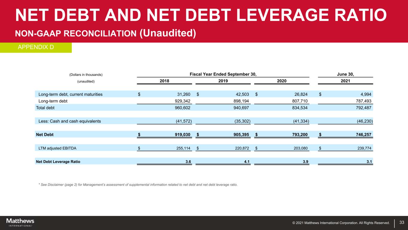 © 2021 Matthews International Corporation. All Rights Reserved. * See Disclaimer (page 2) for Management’s assessment of supplemental information related to net debt and net debt leverage ratio. 33 (Dollars in thousands) Fiscal Year Ended September 30, June 30, (unaudited) 2018 2019 2020 2021 Long-term debt, current maturities $ 31,260 $ 42,503 $ 26,824 $ 4,994 Long-term debt 929,342 898,194 807,710 787,493 Total debt 960,602 940,697 834,534 792,487 Less: Cash and cash equivalents (41,572) (35,302) (41,334) (46,230) Net Debt $ 919,030 $ 905,395 $ 793,200 $ 746,257 LTM adjusted EBITDA $ 255,114 $ 220,872 $ 203,080 $ 239,774 Net Debt Leverage Ratio 3.6 4.1 3.9 3.1 NET DEBT AND NET DEBT LEVERAGE RATIO NON-GAAP RECONCILIATION (Unaudited) APPENDIX D