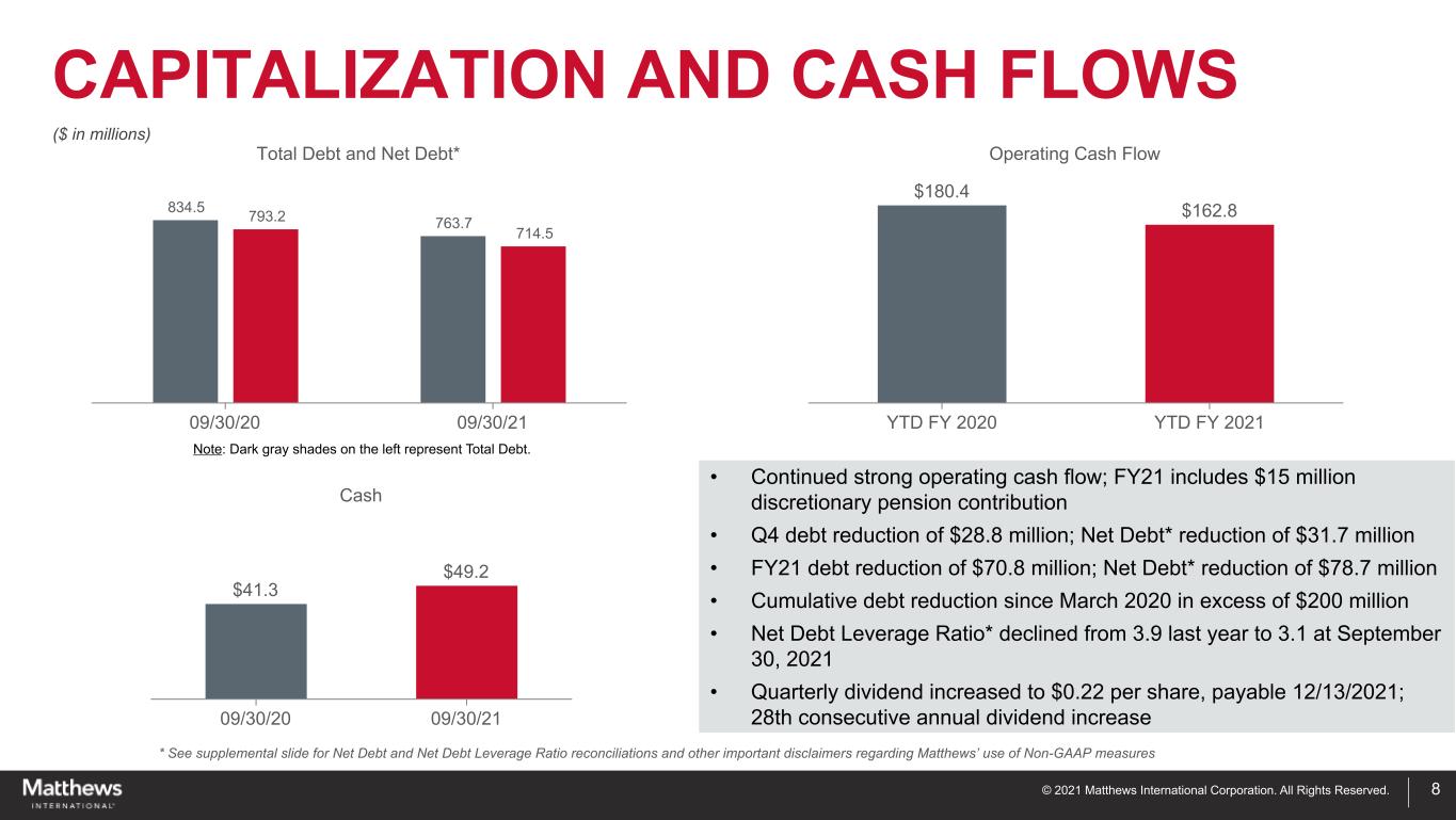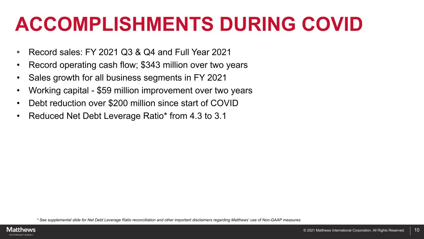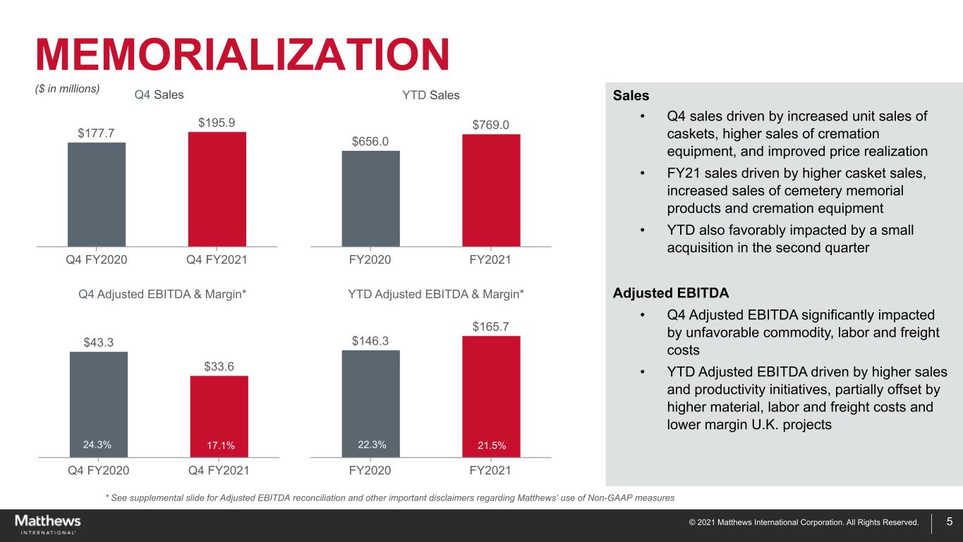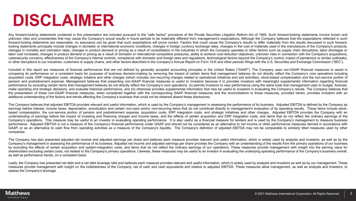© 2021 Matthews International Corporation. All Rights Reserved. DISCLAIMER 2 Any forward-looking statements contained in this presentation are included pursuant to the “safe harbor” provisions of the Private Securities Litigation Reform Act of 1995. Such forward-looking statements involve known and unknown risks and uncertainties that may cause the Company’s actual results in future periods to be materially different from management’s expectations. Although the Company believes that the expectations reflected in such forward-looking statements are reasonable, no assurance can be given that such expectations will prove correct. Factors that could cause the Company's results to differ materially from the results discussed in such forward- looking statements principally include changes in domestic or international economic conditions, changes in foreign currency exchange rates, changes in the cost of materials used in the manufacture of the Company's products, changes in mortality and cremation rates, changes in product demand or pricing as a result of consolidation in the industries in which the Company operates or other factors such as supply chain disruptions, labor shortages or labor cost increases, changes in product demand or pricing as a result of domestic or international competitive pressures, ability to achieve cost-reduction objectives, unknown risks in connection with the Company's acquisitions, cybersecurity concerns, effectiveness of the Company's internal controls, compliance with domestic and foreign laws and regulations, technological factors beyond the Company's control, impact of pandemics or similar outbreaks, or other disruptions to our industries, customers or supply chains, and other factors described in the Company’s Annual Report on Form 10-K and other periodic filings with the U.S. Securities and Exchange Commission (“SEC”). Included in this report are measures of financial performance that are not defined by generally accepted accounting principles in the United States (“GAAP”). The Company uses non-GAAP financial measures to assist in comparing its performance on a consistent basis for purposes of business decision-making by removing the impact of certain items that management believes do not directly reflect the Company’s core operations including acquisition costs, ERP integration costs, strategic initiative and other charges (which includes non-recurring charges related to operational initiatives and exit activities), stock-based compensation and the non-service portion of pension and postretirement expense. Management believes that presenting non-GAAP financial measures is useful to investors because it (i) provides investors with meaningful supplemental information regarding financial performance by excluding certain items that management believes do not directly reflect the Company’s core operations, (ii) permits investors to view performance using the same tools that management uses to budget, forecast, make operating and strategic decisions, and evaluate historical performance, and (iii) otherwise provides supplemental information that may be useful to investors in evaluating the Company’s results. The Company believes that the presentation of these non-GAAP financial measures, when considered together with the corresponding GAAP financial measures and the reconciliations to those measures, provided herein, provides investors with an additional understanding of the factors and trends affecting the Company’s business that could not be obtained absent these disclosures. The Company believes that adjusted EBITDA provides relevant and useful information, which is used by the Company’s management in assessing the performance of its business. Adjusted EBITDA is defined by the Company as earnings before interest, income taxes, depreciation, amortization and certain non-cash and/or non-recurring items that do not contribute directly to management’s evaluation of its operating results. These items include stock- based compensation, the non-service portion of pension and postretirement expense, acquisition costs, ERP integration costs, and strategic initiatives and other charges. Adjusted EBITDA provides the Company with an understanding of earnings before the impact of investing and financing charges and income taxes, and the effects of certain acquisition and ERP integration costs, and items that do not reflect the ordinary earnings of the Company’s operations. This measure may be useful to an investor in evaluating operating performance. It is also useful as a financial measure for lenders and is used by the Company’s management to measure business performance. Adjusted EBITDA is not a measure of the Company's financial performance under GAAP and should not be considered as an alternative to net income or other performance measures derived in accordance with GAAP, or as an alternative to cash flow from operating activities as a measure of the Company's liquidity. The Company's definition of adjusted EBITDA may not be comparable to similarly titled measures used by other companies. The Company has also presented adjusted net income and adjusted earnings per share and believes each measure provides relevant and useful information, which is widely used by analysts and investors, as well as by the Company’s management in assessing the performance of its business. Adjusted net income and adjusted earnings per share provides the Company with an understanding of the results from the primary operations of our business by excluding the effects of certain acquisition and system-integration costs, and items that do not reflect the ordinary earnings of our operations. These measures provide management with insight into the earning value for shareholders excluding certain costs, not related to the Company’s primary operations. Likewise, these measures may be useful to an investor in evaluating the underlying operating performance of the