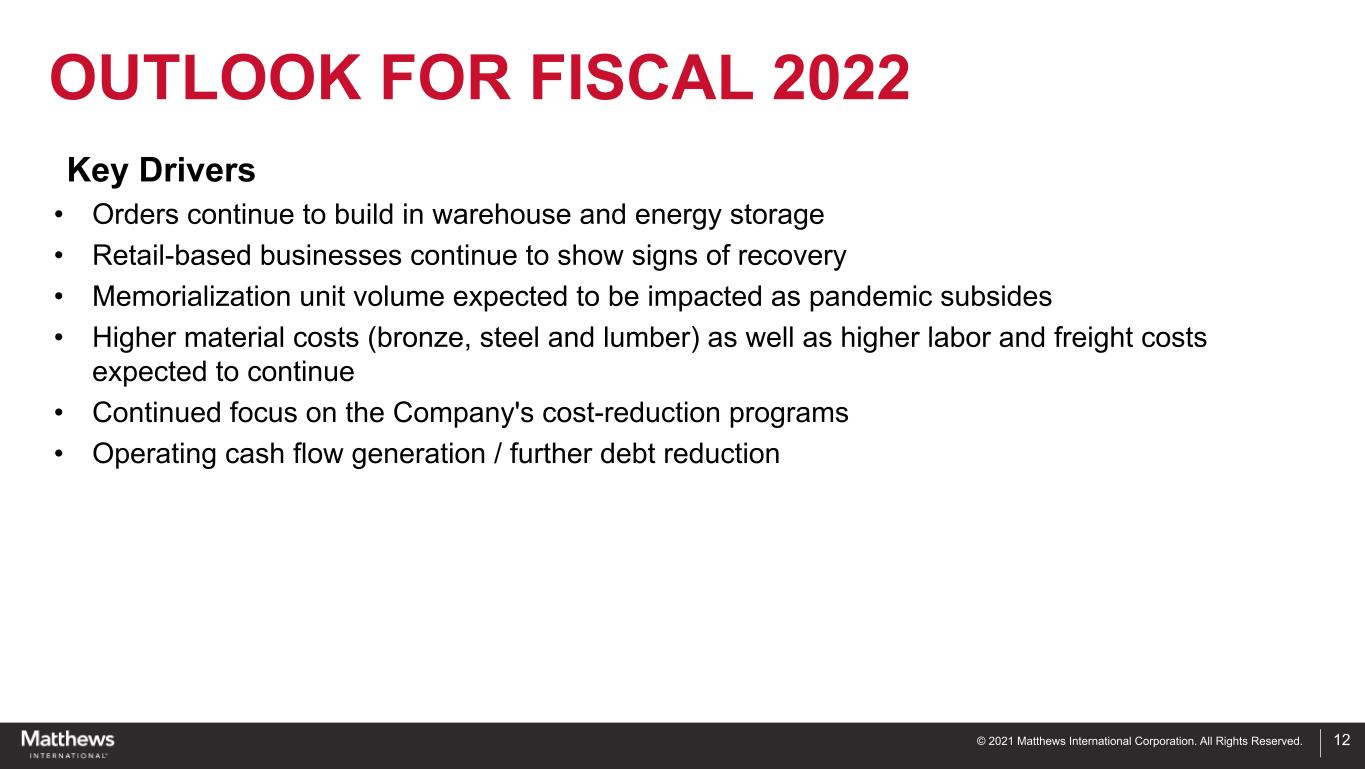 © 2021 Matthews International Corporation. All Rights Reserved. Key Drivers • Orders continue to build in warehouse and energy storage • Retail-based businesses continue to show signs of recovery • Memorialization unit volume expected to be impacted as pandemic subsides • Higher material costs (bronze, steel and lumber) as well as higher labor and freight costs expected to continue • Continued focus on the Company's cost-reduction programs • Operating cash flow generation / further debt reduction OUTLOOK FOR FISCAL 2022 12
