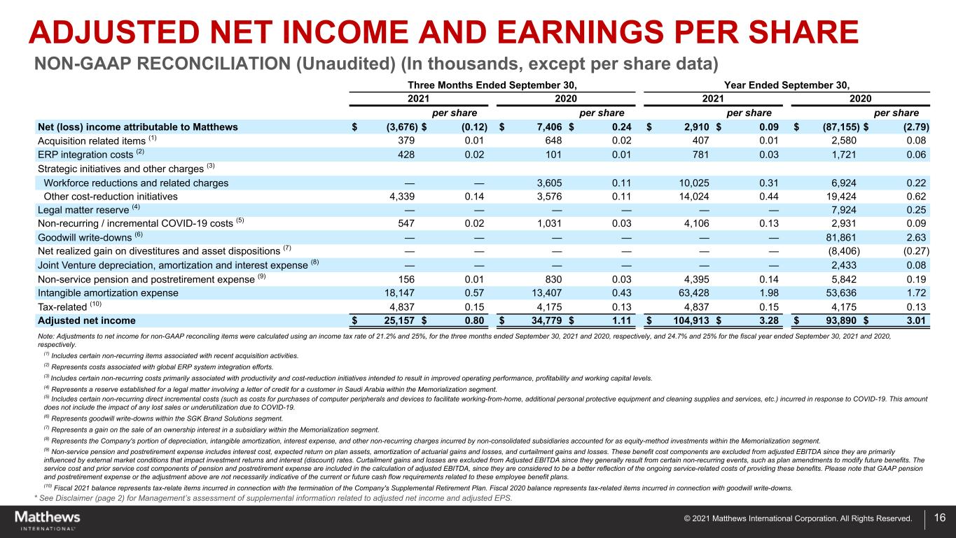 © 2021 Matthews International Corporation. All Rights Reserved. ADJUSTED NET INCOME AND EARNINGS PER SHARE NON-GAAP RECONCILIATION (Unaudited) (In thousands, except per share data) * See Disclaimer (page 2) for Management’s assessment of supplemental information related to adjusted net income and adjusted EPS. 16 Three Months Ended September 30, Year Ended September 30, 2021 2020 2021 2020 per share per share per share per share Net (loss) income attributable to Matthews $ (3,676) $ (0.12) $ 7,406 $ 0.24 $ 2,910 $ 0.09 $ (87,155) $ (2.79) Acquisition related items (1) 379 0.01 648 0.02 407 0.01 2,580 0.08 ERP integration costs (2) 428 0.02 101 0.01 781 0.03 1,721 0.06 Strategic initiatives and other charges (3) Workforce reductions and related charges — — 3,605 0.11 10,025 0.31 6,924 0.22 Other cost-reduction initiatives 4,339 0.14 3,576 0.11 14,024 0.44 19,424 0.62 Legal matter reserve (4) — — — — — — 7,924 0.25 Non-recurring / incremental COVID-19 costs (5) 547 0.02 1,031 0.03 4,106 0.13 2,931 0.09 Goodwill write-downs (6) — — — — — — 81,861 2.63 Net realized gain on divestitures and asset dispositions (7) — — — — — — (8,406) (0.27) Joint Venture depreciation, amortization and interest expense (8) — — — — — — 2,433 0.08 Non-service pension and postretirement expense (9) 156 0.01 830 0.03 4,395 0.14 5,842 0.19 Intangible amortization expense 18,147 0.57 13,407 0.43 63,428 1.98 53,636 1.72 Tax-related (10) 4,837 0.15 4,175 0.13 4,837 0.15 4,175 0.13 Adjusted net income $ 25,157 $ 0.80 $ 34,779 $ 1.11 $ 104,913 $ 3.28 $ 93,890 $ 3.01 Note: Adjustments to net income for non-GAAP reconciling items were calculated using an income tax rate of 21.2% and 25%, for the three months ended September 30, 2021 and 2020, respectively, and 24.7% and 25% for the fiscal year ended September 30, 2021 and 2020, respectively. (1) Includes certain non-recurring items associated with recent acquisition activities. (2) Represents costs associated with global ERP system integration efforts. (3) Includes certain non-recurring costs primarily associated with productivity and cost-reduction initiatives intended to result in improved operating performance, profitability and working capital levels. (4) Represents a reserve established for a legal matter involving a letter of credit for a customer in Saudi Arabia within the Memorialization segment. (5) Includes certain non-recurring direct incremental costs (such as costs for purchases of computer peripherals and devices to facilitate working-from-home, additional personal protective equipment and cleaning supplies and services, etc.) incurred in response to COVID-19. This amount does not include the impact of any lost sales or underutilization due to COVID-19. (6) Represents goodwill write-downs within the SGK Brand Solutions segment. (7) Represents a gain on the sale of an ownership interest in a subsidiary within the Memorialization segment. (8) Represents the Company's portion of depreciation, intangible amortization, interest expense, and other non-recurring charges incurred by non-consolidated subsidiaries accounted for as equity-method investments within the Memorialization segment. (9) Non-service pension and postretirement expense includes interest cost, expected return on plan assets, amortization of actuarial gains and losses, and curtailment gains and losses. These benefit cost components are excluded from adjusted EBITDA since they are primarily influenced by external market conditions that impact investment returns and interest (discount) rates. Curtailment gains and losses are excluded from Adjusted EBITDA since they generally result from certain non-recurring events, such as plan amendments to modify future benefits. The service cost and prior service cost components of pension and postretirement expense are included in the calculation of adjusted EBITDA, since they are considered to be a better reflection of the ongoing service-related costs of providing these benefits. Please note that GAAP pension and postretirement expense or the adjustment above are not necessarily indicative of the current or future cash flow requirements related to these employee benefit plans. (10) Fiscal 2021 balance represents tax-relate items incurred in connection with the termination of the Company's Supplemental Retirement Plan. Fiscal 2020 balance represents tax-related items incurred in connection with goodwill write-downs.