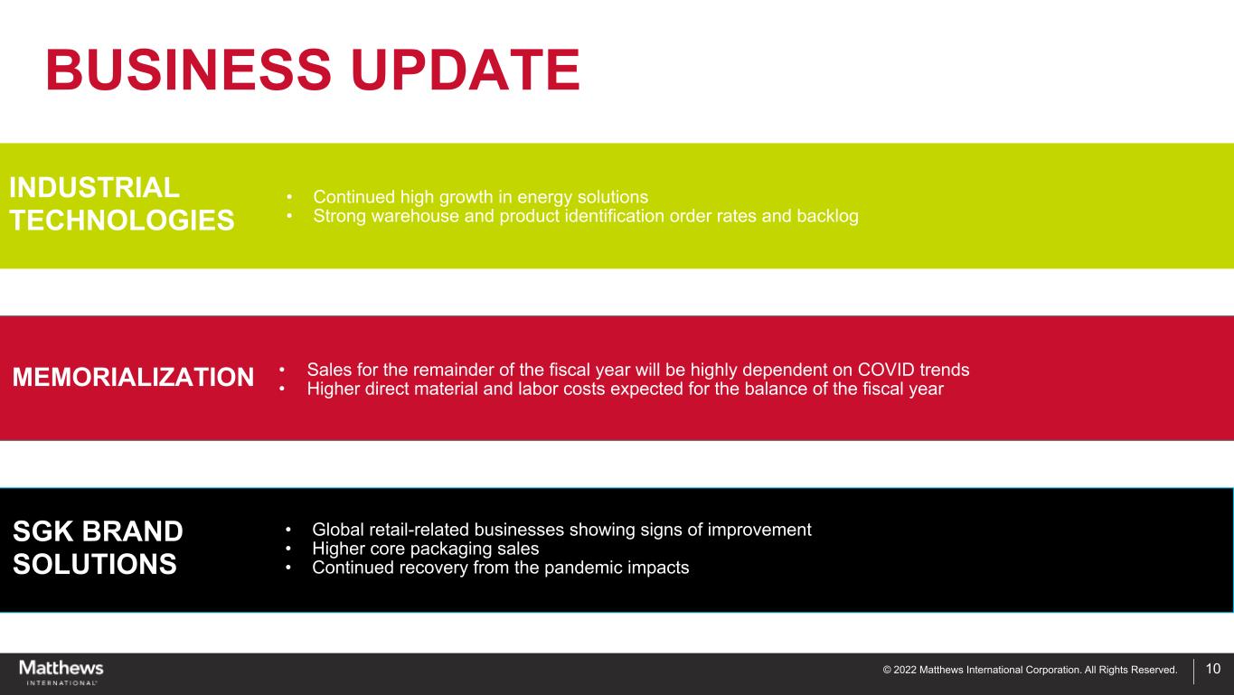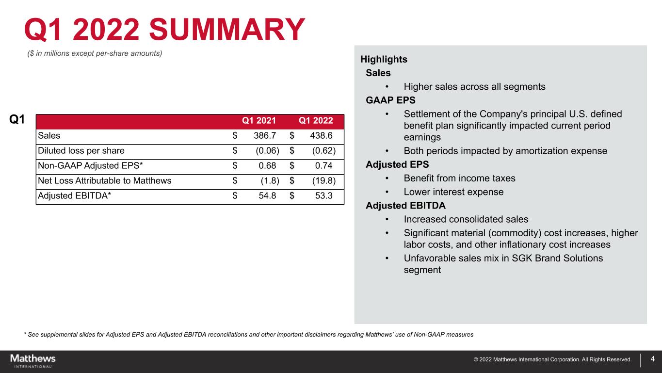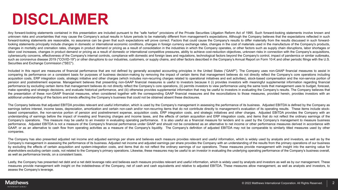 © 2022 Matthews International Corporation. All Rights Reserved. DISCLAIMER 2 Any forward-looking statements contained in this presentation are included pursuant to the “safe harbor” provisions of the Private Securities Litigation Reform Act of 1995. Such forward-looking statements involve known and unknown risks and uncertainties that may cause the Company’s actual results in future periods to be materially different from management’s expectations. Although the Company believes that the expectations reflected in such forward-looking statements are reasonable, no assurance can be given that such expectations will prove correct. Factors that could cause the Company's results to differ materially from the results discussed in such forward- looking statements principally include changes in domestic or international economic conditions, changes in foreign currency exchange rates, changes in the cost of materials used in the manufacture of the Company's products, changes in mortality and cremation rates, changes in product demand or pricing as a result of consolidation in the industries in which the Company operates, or other factors such as supply chain disruptions, labor shortages or labor cost increases, changes in product demand or pricing as a result of domestic or international competitive pressures, ability to achieve cost-reduction objectives, unknown risks in connection with the Company's acquisitions, cybersecurity concerns, effectiveness of the Company's internal controls, compliance with domestic and foreign laws and regulations, technological factors beyond the Company's control, impact of pandemics or similar outbreaks, such as coronavirus disease 2019 ("COVID-19") or other disruptions to our industries, customers, or supply chains, and other factors described in the Company’s Annual Report on Form 10-K and other periodic filings with the U.S. Securities and Exchange Commission ("SEC"). Included in this report are measures of financial performance that are not defined by generally accepted accounting principles in the United States (“GAAP”). The Company uses non-GAAP financial measures to assist in comparing its performance on a consistent basis for purposes of business decision-making by removing the impact of certain items that management believes do not directly reflect the Company’s core operations including acquisition costs, ERP integration costs, strategic initiative and other charges (which includes non-recurring charges related to operational initiatives and exit activities), stock-based compensation and the non-service portion of pension and postretirement expense. Management believes that presenting non-GAAP financial measures is useful to investors because it (i) provides investors with meaningful supplemental information regarding financial performance by excluding certain items that management believes do not directly reflect the Company’s core operations, (ii) permits investors to view performance using the same tools that management uses to budget, forecast, make operating and strategic decisions, and evaluate historical performance, and (iii) otherwise provides supplemental information that may be useful to investors in evaluating the Company’s results. The Company believes that the presentation of these non-GAAP financial measures, when considered together with the corresponding GAAP financial measures and the reconciliations to those measures, provided herein, provides investors with an additional understanding of the factors and trends affecting the Company’s business that could not be obtained absent these disclosures. The Company believes that adjusted EBITDA provides relevant and useful information, which is used by the Company’s management in assessing the performance of its business. Adjusted EBITDA is defined by the Company as earnings before interest, income taxes, depreciation, amortization and certain non-cash and/or non-recurring items that do not contribute directly to management’s evaluation of its operating results. These items include stock- based compensation, the non-service portion of pension and postretirement expense, acquisition costs, ERP integration costs, and strategic initiatives and other charges. Adjusted EBITDA provides the Company with an understanding of earnings before the impact of investing and financing charges and income taxes, and the effects of certain acquisition and ERP integration costs, and items that do not reflect the ordinary earnings of the Company’s operations. This measure may be useful to an investor in evaluating operating performance. It is also useful as a financial measure for lenders and is used by the Company’s management to measure business performance. Adjusted EBITDA is not a measure of the Company's financial performance under GAAP and should not be considered as an alternative to net income or other performance measures derived in accordance with GAAP, or as an alternative to cash flow from operating activities as a measure of the Company's liquidity. The Company's definition of adjusted EBITDA may not be comparable to similarly titled measures used by other companies. The Company has also presented adjusted net income and adjusted earnings per share and believes each measure provides relevant and useful information, which is widely used by analysts and investors, as well as by the Company’s management in assessing the performance of its business. Adjusted net income and adjusted earnings per share provides the Company with an understanding of the results from the primary operations of our business by excluding the effects of certain acquisition and system-integration costs, and items that do not reflect the ordinary earnings of our operations. These measures provide management with insight into the earning value for shareholders excluding certain costs, not related to the Company’s primary operations. Likewise, these measures may be useful to an investor in evaluating