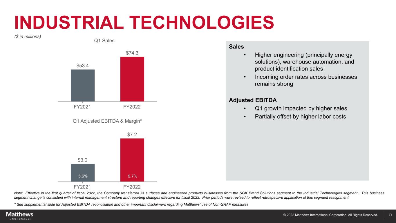 © 2022 Matthews International Corporation. All Rights Reserved. Q1 2022 SUMMARY 4 ($ in millions except per-share amounts) Q1 Q1 2021 Q1 2022 Sales $ 386.7 $ 438.6 Diluted loss per share $ (0.06) $ (0.62) Non-GAAP Adjusted EPS* $ 0.68 $ 0.74 Net Loss Attributable to Matthews $ (1.8) $ (19.8) Adjusted EBITDA* $ 54.8 $ 53.3 Highlights Sales • Higher sales across all segments GAAP EPS • Settlement of the Company's principal U.S. defined benefit plan significantly impacted current period earnings • Both periods impacted by amortization expense Adjusted EPS • Benefit from income taxes • Lower interest expense Adjusted EBITDA • Increased consolidated sales • Significant material (commodity) cost increases, higher labor costs, and other inflationary cost increases • Unfavorable sales mix in SGK Brand Solutions segment * See supplemental slides for Adjusted EPS and Adjusted EBITDA reconciliations and other important disclaimers regarding Matthews’ use of Non-GAAP measures