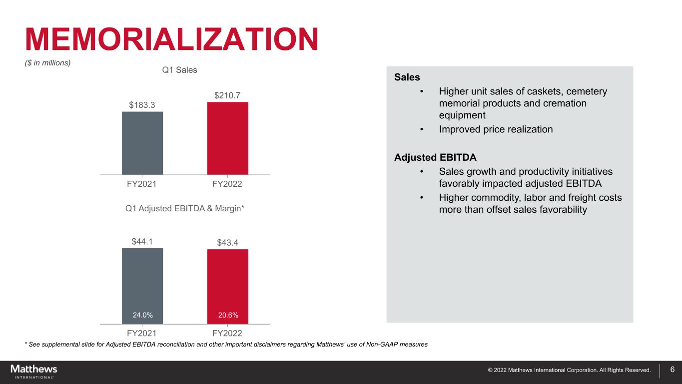 © 2022 Matthews International Corporation. All Rights Reserved. INDUSTRIAL TECHNOLOGIES 5 15.5% 12.4% 15.6%10.3% ($ in millions) $53.4 $74.3 FY2021 FY2022 $3.0 $7.2 FY2021 FY2022 5.6% 9.7% Q1 Sales Q1 Adjusted EBITDA & Margin* Sales • Higher engineering (principally energy solutions), warehouse automation, and product identification sales • Incoming order rates across businesses remains strong Adjusted EBITDA • Q1 growth impacted by higher sales • Partially offset by higher labor costs Note: Effective in the first quarter of fiscal 2022, the Company transferred its surfaces and engineered products businesses from the SGK Brand Solutions segment to the Industrial Technologies segment. This business segment change is consistent with internal management structure and reporting changes effective for fiscal 2022. Prior periods were revised to reflect retrospective application of this segment realignment. * See supplemental slide for Adjusted EBITDA reconciliation and other important disclaimers regarding Matthews’ use of Non-GAAP measures