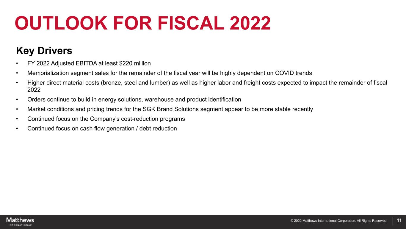 © 2022 Matthews International Corporation. All Rights Reserved. 10 SGK BRAND SOLUTIONS MEMORIALIZATION INDUSTRIAL TECHNOLOGIES • Sales for the remainder of the fiscal year will be highly dependent on COVID trends • Higher direct material and labor costs expected for the balance of the fiscal year • Global retail-related businesses showing signs of improvement • Higher core packaging sales • Continued recovery from the pandemic impacts • Continued high growth in energy solutions • Strong warehouse and product identification order rates and backlog BUSINESS UPDATE