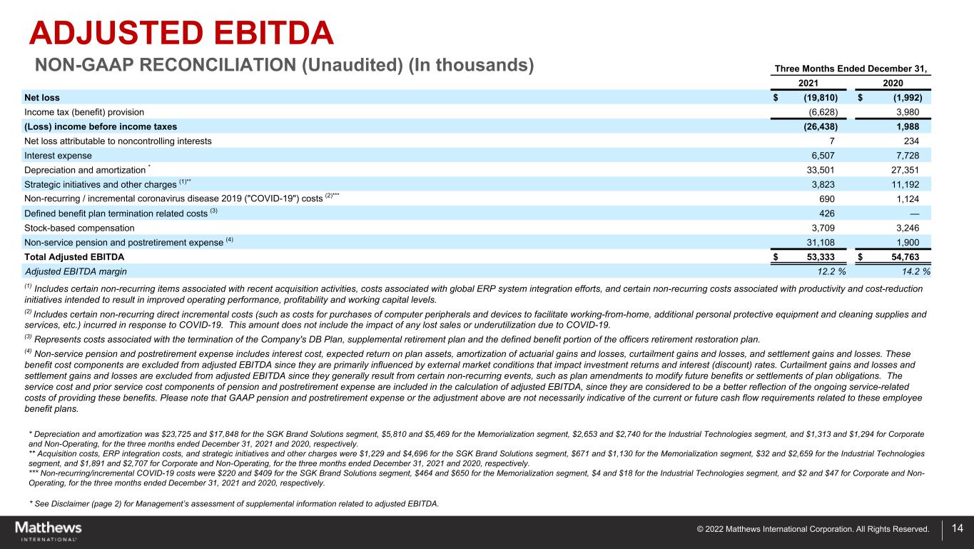 © 2022 Matthews International Corporation. All Rights Reserved. 13 Included in this report are measures of financial performance that are not defined by GAAP, including, without limitation, adjusted EBITDA, adjusted net income and EPS, net debt and net debt leverage ratio. The Company defines net debt leverage ratio as outstanding debt (net of cash) relative to adjusted EBITDA. The Company uses non-GAAP financial measures to assist in comparing its performance on a consistent basis for purposes of business decision-making by removing the impact of certain items that management believes do not directly reflect the Company’s core operations including acquisition costs, ERP integration costs, strategic initiative and other charges (which includes non-recurring charges related to operational initiatives and exit activities), stock- based compensation and the non-service portion of pension and postretirement expense. Management believes that presenting non- GAAP financial measures is useful to investors because it (i) provides investors with meaningful supplemental information regarding financial performance by excluding certain items that management believes do not directly reflect the Company's core operations, (ii) permits investors to view performance using the same tools that management uses to budget, forecast, make operating and strategic decisions, and evaluate historical performance, and (iii) otherwise provides supplemental information that may be useful to investors in evaluating the Company’s results. The Company's calculations of its non-GAAP financial measures, however, may not be comparable to similarly titled measures reported by other companies. The Company believes that the presentation of these non-GAAP financial measures, when considered together with the corresponding GAAP financial measures and the reconciliations to those measures, provided herein, provide investors with an additional understanding of the factors and trends affecting the Company’s business that could not be obtained absent these disclosures. RECONCILIATIONS OF NON-GAAP FINANCIAL MEASURES
