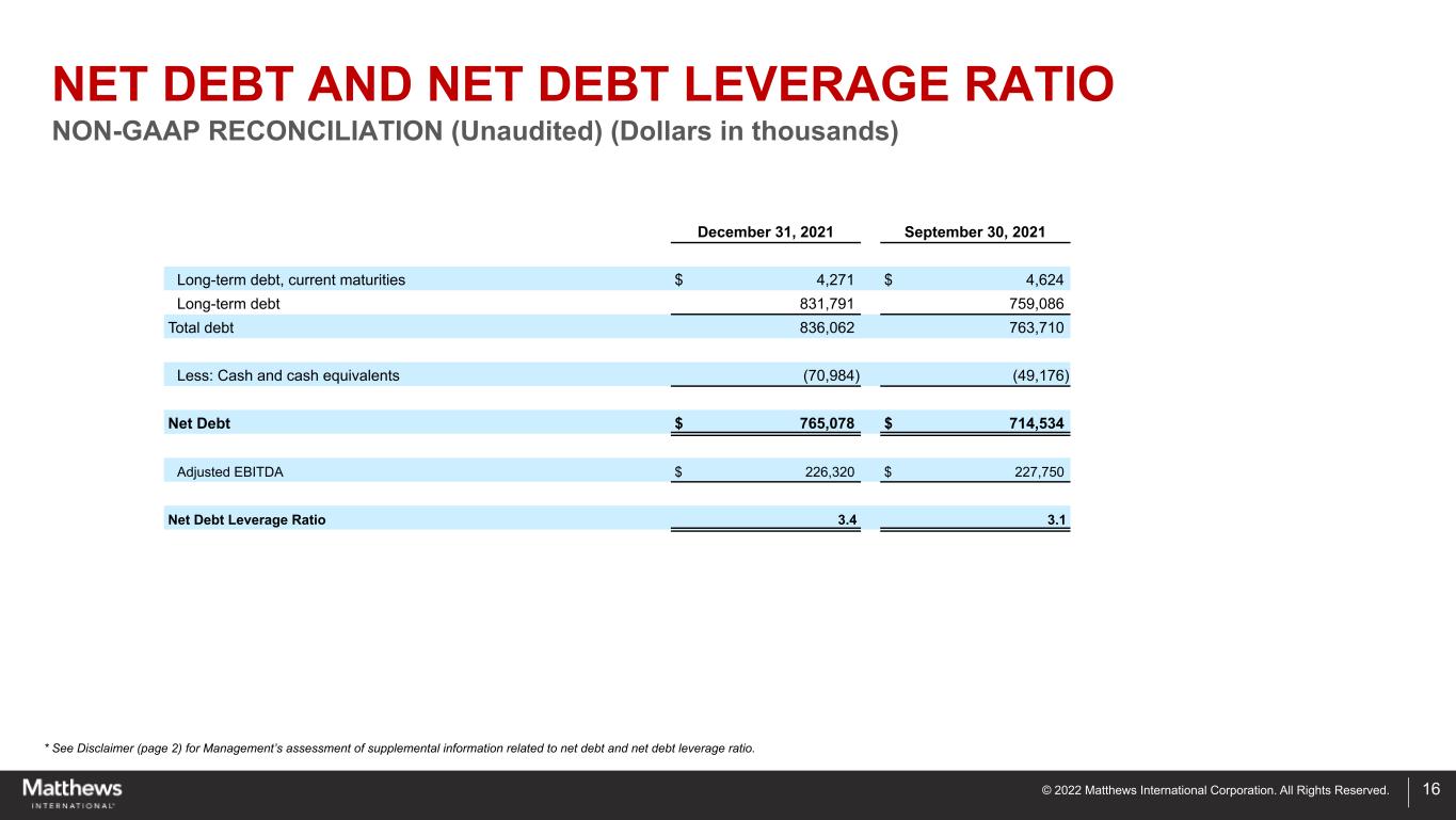 © 2022 Matthews International Corporation. All Rights Reserved. ADJUSTED NET INCOME AND EARNINGS PER SHARE NON-GAAP RECONCILIATION (Unaudited) (In thousands, except per share data) * See Disclaimer (page 2) for Management’s assessment of supplemental information related to adjusted net income and adjusted EPS. 15 Three Months Ended December 31, 2021 2020 per share per share Net income (loss) attributable to Matthews $ (19,803) $ (0.62) $ (1,758) $ (0.06) Strategic initiatives and other charges (1) 3,009 0.08 9,844 0.31 Non-recurring / incremental COVID-19 costs (2) 536 0.02 873 0.03 Defined benefit plan termination related costs (3) 319 0.01 — — Non-service pension and postretirement expense (4) 23,331 0.74 1,406 0.04 Amortization 16,160 0.51 11,263 0.36 Adjusted net income $ 23,552 $ 0.74 $ 21,628 $ 0.68 Note: Adjustments to net income for non-GAAP reconciling items were calculated using an income tax rate of 24.7% for the three months ended December 31, 2021, and 20.6% for the three months ended December 31, 2020. (1) Includes certain non-recurring items associated with recent acquisition activities, costs associated with global ERP system integration efforts, and certain non-recurring costs associated with productivity and cost- reduction initiatives intended to result in improved operating performance, profitability and working capital levels. (2) Includes certain non-recurring direct incremental costs (such as costs for purchases of computer peripherals and devices to facilitate working-from-home, additional personal protective equipment and cleaning supplies and services, etc.) incurred in response to COVID-19. This amount does not include the impact of any lost sales or underutilization due to COVID-19. (3) Represents costs associated with the termination of the Company's DB Plan, supplemental retirement plan and the defined benefit portion of the officers retirement restoration plan. (4) Non-service pension and postretirement expense includes interest cost, expected return on plan assets, amortization of actuarial gains and losses, curtailment gains and losses, and settlement gains and losses. These benefit cost components are excluded from adjusted EBITDA since they are primarily influenced by external market conditions that impact investment returns and interest (discount) rates. Curtailment gains and losses and settlement gains and losses are excluded from adjusted EBITDA since they generally result from certain non-recurring events, such as plan amendments to modify future benefits or settlements of plan obligations. The service cost and prior service cost components of pension and postretirement expense are included in the calculation of adjusted EBITDA, since they are considered to be a better reflection of the ongoing service-related costs of providing these benefits. Please note that GAAP pension and postretirement expense or the adjustment above are not necessarily indicative of the current or future cash flow requirements related to these employee benefit plans.