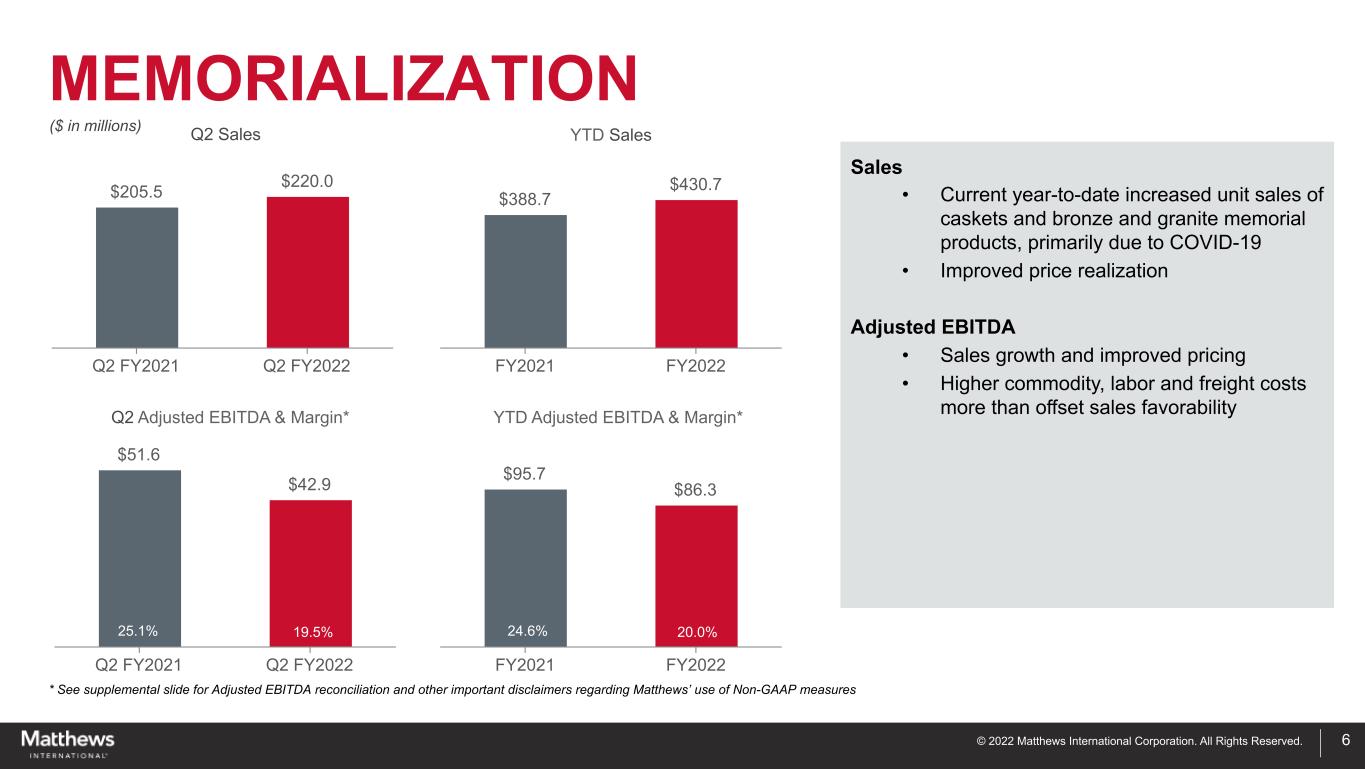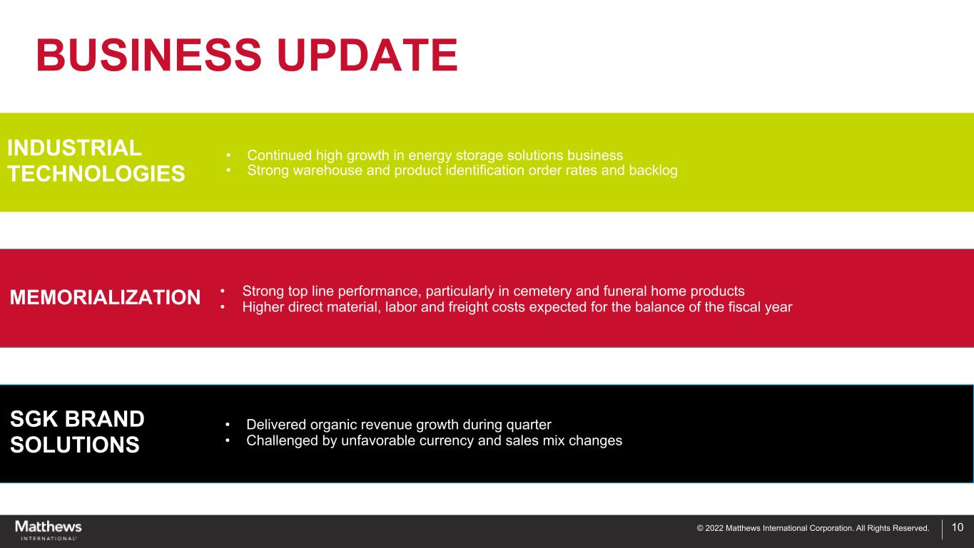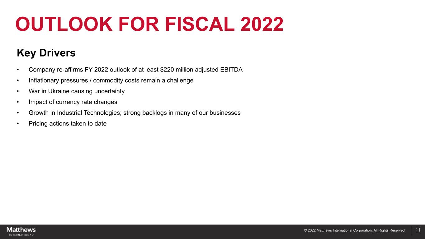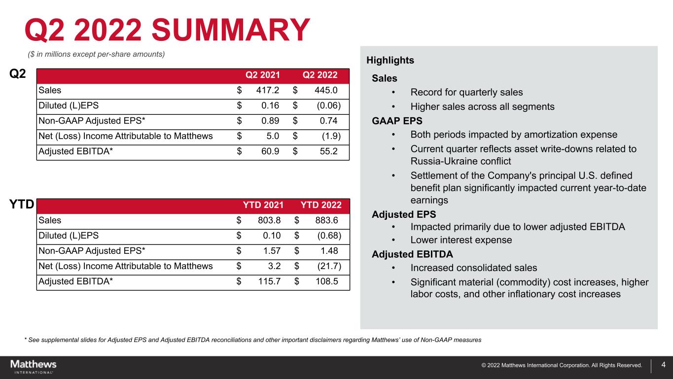 © 2022 Matthews International Corporation. All Rights Reserved. DISCLAIMER 2 Any forward-looking statements contained in this presentation are included pursuant to the “safe harbor” provisions of the Private Securities Litigation Reform Act of 1995. Such forward-looking statements involve known and unknown risks and uncertainties that may cause the Company’s actual results in future periods to be materially different from management’s expectations. Although the Company believes that the expectations reflected in such forward-looking statements are reasonable, no assurance can be given that such expectations will prove correct. Factors that could cause the Company's results to differ materially from the results discussed in such forward- looking statements principally include changes in domestic or international economic conditions, changes in foreign currency exchange rates, changes in the cost of materials used in the manufacture of the Company's products, changes in mortality and cremation rates, changes in product demand or pricing as a result of consolidation in the industries in which the Company operates, or other factors such as supply chain disruptions, labor shortages or labor cost increases, changes in product demand or pricing as a result of domestic or international competitive pressures, ability to achieve cost-reduction objectives, unknown risks in connection with the Company's acquisitions, cybersecurity concerns, effectiveness of the Company's internal controls, compliance with domestic and foreign laws and regulations, technological factors beyond the Company's control, impact of pandemics or similar outbreaks, or other disruptions to our industries, customers, or supply chains, the impact of global conflicts, such as the current war between Russia and Ukraine, and other factors described in the Company’s Annual Report on Form 10-K and other periodic filings with the U.S. Securities and Exchange Commission ("SEC"). Included in this report are measures of financial performance that are not defined by generally accepted accounting principles in the United States (“GAAP”). The Company uses non-GAAP financial measures to assist in comparing its performance on a consistent basis for purposes of business decision-making by removing the impact of certain items that management believes do not directly reflect the Company’s core operations including acquisition costs, ERP integration costs, strategic initiative and other charges (which includes non-recurring charges related to operational initiatives and exit activities), stock-based compensation and the non-service portion of pension and postretirement expense. Management believes that presenting non-GAAP financial measures is useful to investors because it (i) provides investors with meaningful supplemental information regarding financial performance by excluding certain items that management believes do not directly reflect the Company’s core operations, (ii) permits investors to view performance using the same tools that management uses to budget, forecast, make operating and strategic decisions, and evaluate historical performance, and (iii) otherwise provides supplemental information that may be useful to investors in evaluating the Company’s results. The Company believes that the presentation of these non-GAAP financial measures, when considered together with the corresponding GAAP financial measures and the reconciliations to those measures, provided herein, provides investors with an additional understanding of the factors and trends affecting the Company’s business that could not be obtained absent these disclosures. The Company believes that adjusted EBITDA provides relevant and useful information, which is used by the Company’s management in assessing the performance of its business. Adjusted EBITDA is defined by the Company as earnings before interest, income taxes, depreciation, amortization and certain non-cash and/or non-recurring items that do not contribute directly to management’s evaluation of its operating results. These items include stock- based compensation, the non-service portion of pension and postretirement expense, acquisition costs, ERP integration costs, and strategic initiatives and other charges. Adjusted EBITDA provides the Company with an understanding of earnings before the impact of investing and financing charges and income taxes, and the effects of certain acquisition and ERP integration costs, and items that do not reflect the ordinary earnings of the Company’s operations. This measure may be useful to an investor in evaluating operating performance. It is also useful as a financial measure for lenders and is used by the Company’s management to measure business performance. Adjusted EBITDA is not a measure of the Company's financial performance under GAAP and should not be considered as an alternative to net income or other performance measures derived in accordance with GAAP, or as an alternative to cash flow from operating activities as a measure of the Company's liquidity. The Company's definition of adjusted EBITDA may not be comparable to similarly titled measures used by other companies. The Company has also presented adjusted net income and adjusted earnings per share and believes each measure provides relevant and useful information, which is widely used by analysts and investors, as well as by the Company’s management in assessing the performance of its business. Adjusted net income and adjusted earnings per share provides the Company with an understanding of the results from the primary operations of our business by excluding the effects of certain acquisition and system-integration costs, and items that do not reflect the ordinary earnings of our operations. These measures provide management with insight into the earning value for shareholders excluding certain costs, not related to the Company’s primary operations. Likewise, these measures may 