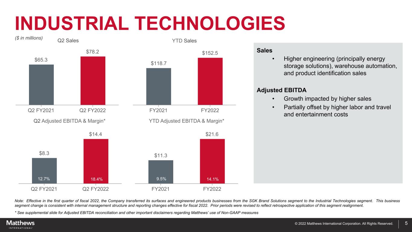 © 2022 Matthews International Corporation. All Rights Reserved. Q2 2022 SUMMARY 4 Q2 2021 Q2 2022 Sales $ 417.2 $ 445.0 Diluted (L)EPS $ 0.16 $ (0.06) Non-GAAP Adjusted EPS* $ 0.89 $ 0.74 Net (Loss) Income Attributable to Matthews $ 5.0 $ (1.9) Adjusted EBITDA* $ 60.9 $ 55.2 ($ in millions except per-share amounts) Q2 YTD YTD 2021 YTD 2022 Sales $ 803.8 $ 883.6 Diluted (L)EPS $ 0.10 $ (0.68) Non-GAAP Adjusted EPS* $ 1.57 $ 1.48 Net (Loss) Income Attributable to Matthews $ 3.2 $ (21.7) Adjusted EBITDA* $ 115.7 $ 108.5 Highlights Sales • Record for quarterly sales • Higher sales across all segments GAAP EPS • Both periods impacted by amortization expense • Current quarter reflects asset write-downs related to Russia-Ukraine conflict • Settlement of the Company's principal U.S. defined benefit plan significantly impacted current year-to-date earnings Adjusted EPS • Impacted primarily due to lower adjusted EBITDA • Lower interest expense Adjusted EBITDA • Increased consolidated sales • Significant material (commodity) cost increases, higher labor costs, and other inflationary cost increases * See supplemental slides for Adjusted EPS and Adjusted EBITDA reconciliations and other important disclaimers regarding Matthews’ use of Non-GAAP measures