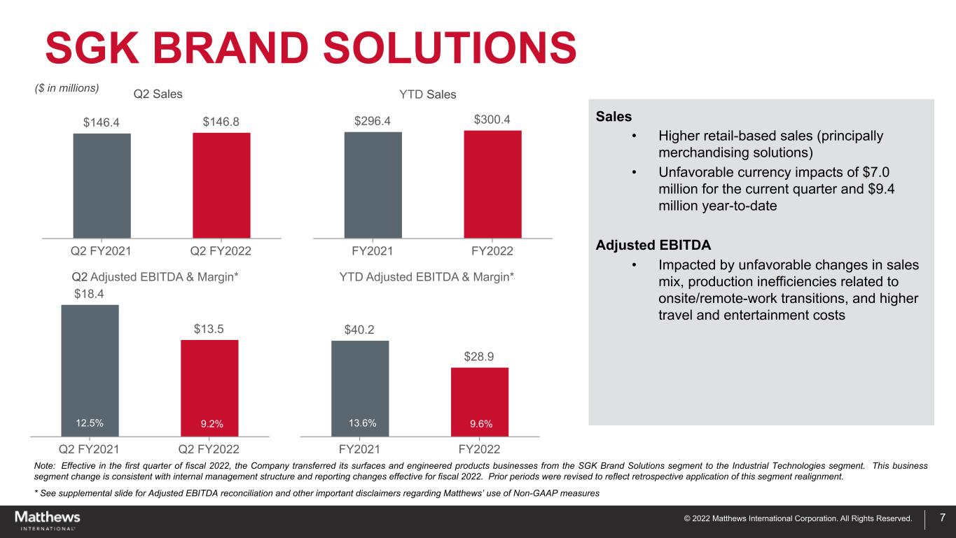 © 2022 Matthews International Corporation. All Rights Reserved. MEMORIALIZATION 6 23.0% 21.1% $205.5 $220.0 Q2 FY2021 Q2 FY2022 $388.7 $430.7 FY2021 FY2022 $51.6 $42.9 Q2 FY2021 Q2 FY2022 $95.7 $86.3 FY2021 FY2022 25.1% 19.5% 24.6% 20.0% ($ in millions) Q2 Sales Q2 Adjusted EBITDA & Margin* YTD Sales YTD Adjusted EBITDA & Margin* Sales • Current year-to-date increased unit sales of caskets and bronze and granite memorial products, primarily due to COVID-19 • Improved price realization Adjusted EBITDA • Sales growth and improved pricing • Higher commodity, labor and freight costs more than offset sales favorability * See supplemental slide for Adjusted EBITDA reconciliation and other important disclaimers regarding Matthews’ use of Non-GAAP measures