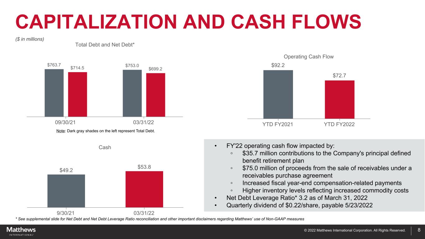 © 2022 Matthews International Corporation. All Rights Reserved. • FY'22 operating cash flow impacted by: ◦ $35.7 million contributions to the Company's principal defined benefit retirement plan ◦ $75.0 million of proceeds from the sale of receivables under a receivables purchase agreement ◦ Increased fiscal year-end compensation-related payments ◦ Higher inventory levels reflecting increased commodity costs • Net Debt Leverage Ratio* 3.2 as of March 31, 2022 • Quarterly dividend of $0.22/share, payable 5/23/2022 CAPITALIZATION AND CASH FLOWS 8 * See supplemental slide for Net Debt and Net Debt Leverage Ratio reconciliation and other important disclaimers regarding Matthews’ use of Non-GAAP measures Note: Dark gray shades on the left represent Total Debt. Total Debt and Net Debt* $763.7 $753.0$714.5 $699.2 09/30/21 03/31/22 ($ in millions) Cash $49.2 $53.8 9/30/21 03/31/22 Operating Cash Flow $92.2 $72.7 YTD FY2021 YTD FY2022