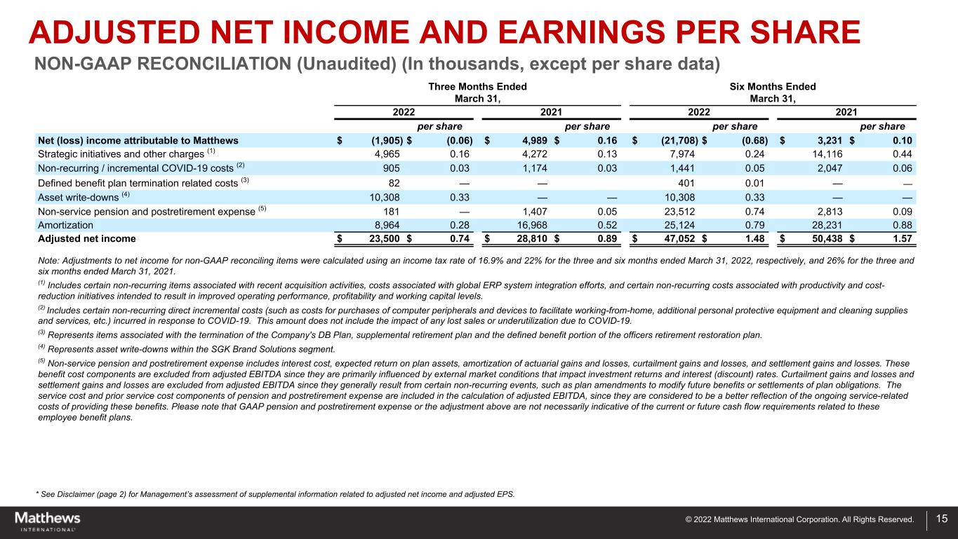 © 2022 Matthews International Corporation. All Rights Reserved. * See Disclaimer (page 2) for Management’s assessment of supplemental information related to adjusted EBITDA. 14 Three Months Ended March 31, Six Months Ended March 31, 2022 2021 2022 2021 Net (loss) income $ (1,936) $ 5,152 $ (21,746) $ 3,160 Income tax provision (benefit) 3,277 972 (3,351) 4,952 Income (loss) before income taxes $ 1,341 $ 6,124 (25,097) 8,112 Net loss (income) attributable to noncontrolling interests 31 (163) 38 71 Interest expense 6,260 7,233 12,767 14,961 Depreciation and amortization * 23,724 35,179 57,225 62,530 Strategic initiatives and other charges (1)** 6,750 5,093 10,573 16,285 Non-recurring / incremental coronavirus disease 2019 ("COVID-19") costs (2)*** 1,213 1,572 1,903 2,696 Defined benefit plan termination related items (3) (79) — 347 — Asset write-downs (4) 10,486 — 10,486 — Stock-based compensation 5,222 4,001 8,931 7,247 Non-service pension and postretirement expense (5) 242 1,901 31,350 3,801 Total Adjusted EBITDA $ 55,190 $ 60,940 $ 108,523 $ 115,703 Adjusted EBITDA margin 12.4 % 14.6 % 12.3 % 14.4 % (1) Includes certain non-recurring items associated with recent acquisition activities, costs associated with global ERP system integration efforts, and certain non-recurring costs associated with productivity and cost-reduction initiatives intended to result in improved operating performance, profitability and working capital levels. (2) Includes certain non-recurring direct incremental costs (such as costs for purchases of computer peripherals and devices to facilitate working-from-home, additional personal protective equipment and cleaning supplies and services, etc.) incurred in response to COVID-19. This amount does not include the impact of any lost sales or underutilization due to COVID-19. (3) Represents items associated with the termination of the Company's DB Plan, supplemental retirement plan and the defined benefit portion of the officers retirement restoration plan. (4) Represents asset write-downs within the SGK Brand Solutions segment. (5) Non-service pension and postretirement expense includes interest cost, expected return on plan assets, amortization of actuarial gains and losses, curtailment gains and losses, and settlement gains and losses. These benefit cost components are excluded from adjusted EBITDA since they are primarily influenced by external market conditions that impact investment returns and interest (discount) rates. Curtailment gains and losses and settlement gains and losses are excluded from adjusted EBITDA since they generally result from certain non-recurring events, such as plan amendments to modify future benefits or settlements of plan obligations. The service cost and prior service cost components of pension and postretirement expense are included in the calculation of adjusted EBITDA, since they are considered to be a better reflection of the ongoing service-related costs of providing these benefits. Please note that GAAP pension and postretirement expense or the adjustment above are not necessarily indicative of the current or future cash flow requirements related to these employee benefit plans. * Depreciation and amortization was $14,060 and $25,261 for the SGK Brand Solutions segment, $5,803 and $5,709 for the Memorialization segment, $2,531 and $2,880 for the Industrial Technologies segment, and $1,330 and $1,329 for Corporate and Non-Operating, for the three months ended March 31, 2022 and 2021, respectively. Depreciation and amortization was $37,785 and $43,109 for the SGK Brand Solutions segment, $11,613 and $11,178 for the Memorialization segment, $5,184 and $5,620 for the Industrial Technologies segment, and $2,643 and $2,623 for Corporate and Non-Operating, for the six months ended March 31, 2022 and 2021, respectively. ** Acquisition costs, ERP integration costs, and strategic initiatives and other charges were $4,475 and $2,865 for the SGK Brand Solutions segment, charges of $516 and income of $335 for the Memorialization segment, charges of $161 and $126 for the Industrial Technologies segment, and $1,598 and $2,437 for Corporate and Non-Operating, for the three months ended March 31, 2022 and 2021, respectively. Acquisition costs, ERP integration costs, and strategic initiatives and other charges were $5,703 and $7,561 for the SGK Brand Solutions segment, $1,188 and $795 for the Memorialization segment, $193 and $2,785 for the Industrial Technologies segment, and $3,489 and $5,144 for Corporate and Non-Operating, for the six months ended March 31, 2022 and 2021, respectively. *** Non-recurring/incremental COVID-19 costs were $170 and $297 for the SGK Brand Solutions segment, $579 and $1,240 for the Memorialization segment, $1 and $12 for the Industrial Technologies segment, and $463 and $23 for Corporate and Non-Operating, for the three months ended March 31, 2022 and 2021, respectively. Non-recurring/incremental COVID-19 costs were $390 and $706 for the SGK Brand Solutions segment, $1,043 and $1,890 for the Memorialization segment, $5 and $30 for the Industrial Technologies segment, and $465 and $70 for Corporate and Non-Operating, for the six months ended March 31, 2022 and 2021, respectively. ADJUSTED EBITDA NON-GAAP RECONCILIATION (Unaudited) (In thousands)
