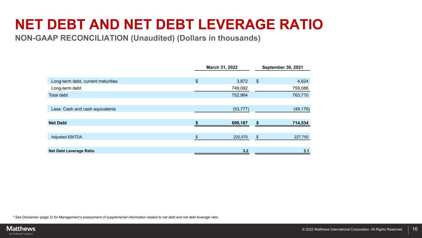 © 2022 Matthews International Corporation. All Rights Reserved. ADJUSTED NET INCOME AND EARNINGS PER SHARE NON-GAAP RECONCILIATION (Unaudited) (In thousands, except per share data) * See Disclaimer (page 2) for Management’s assessment of supplemental information related to adjusted net income and adjusted EPS. 15 Three Months Ended March 31, Six Months Ended March 31, 2022 2021 2022 2021 per share per share per share per share Net (loss) income attributable to Matthews $ (1,905) $ (0.06) $ 4,989 $ 0.16 $ (21,708) $ (0.68) $ 3,231 $ 0.10 Strategic initiatives and other charges (1) 4,965 0.16 4,272 0.13 7,974 0.24 14,116 0.44 Non-recurring / incremental COVID-19 costs (2) 905 0.03 1,174 0.03 1,441 0.05 2,047 0.06 Defined benefit plan termination related costs (3) 82 — — 401 0.01 — — Asset write-downs (4) 10,308 0.33 — — 10,308 0.33 — — Non-service pension and postretirement expense (5) 181 — 1,407 0.05 23,512 0.74 2,813 0.09 Amortization 8,964 0.28 16,968 0.52 25,124 0.79 28,231 0.88 Adjusted net income $ 23,500 $ 0.74 $ 28,810 $ 0.89 $ 47,052 $ 1.48 $ 50,438 $ 1.57 Note: Adjustments to net income for non-GAAP reconciling items were calculated using an income tax rate of 16.9% and 22% for the three and six months ended March 31, 2022, respectively, and 26% for the three and six months ended March 31, 2021. (1) Includes certain non-recurring items associated with recent acquisition activities, costs associated with global ERP system integration efforts, and certain non-recurring costs associated with productivity and cost- reduction initiatives intended to result in improved operating performance, profitability and working capital levels. (2) Includes certain non-recurring direct incremental costs (such as costs for purchases of computer peripherals and devices to facilitate working-from-home, additional personal protective equipment and cleaning supplies and services, etc.) incurred in response to COVID-19. This amount does not include the impact of any lost sales or underutilization due to COVID-19. (3) Represents items associated with the termination of the Company's DB Plan, supplemental retirement plan and the defined benefit portion of the officers retirement restoration plan. (4) Represents asset write-downs within the SGK Brand Solutions segment. (5) Non-service pension and postretirement expense includes interest cost, expected return on plan assets, amortization of actuarial gains and losses, curtailment gains and losses, and settlement gains and losses. These benefit cost components are excluded from adjusted EBITDA since they are primarily influenced by external market conditions that impact investment returns and interest (discount) rates. Curtailment gains and losses and settlement gains and losses are excluded from adjusted EBITDA since they generally result from certain non-recurring events, such as plan amendments to modify future benefits or settlements of plan obligations. The service cost and prior service cost components of pension and postretirement expense are included in the calculation of adjusted EBITDA, since they are considered to be a better reflection of the ongoing service-related costs of providing these benefits. Please note that GAAP pension and postretirement expense or the adjustment above are not necessarily indicative of the current or future cash flow requirements related to these employee benefit plans.