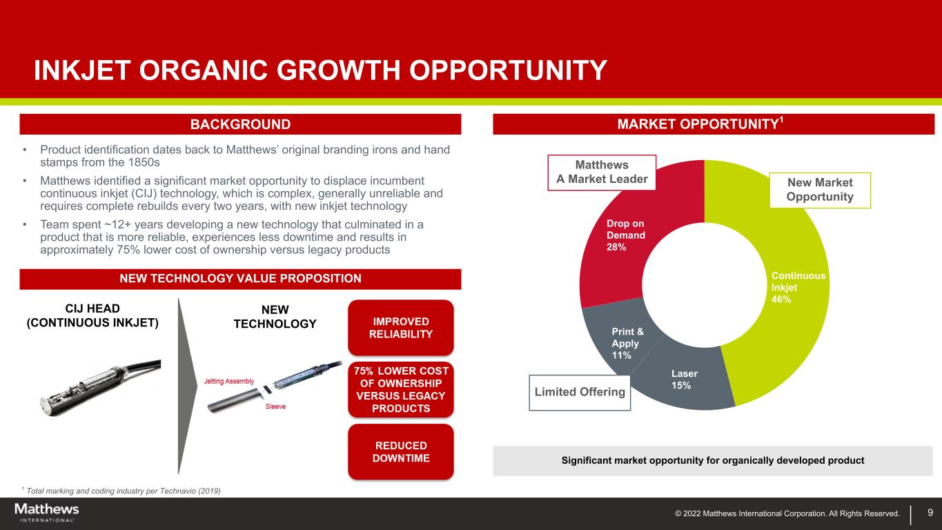 © 2022 Matthews International Corporation. All Rights Reserved. 9 INKJET ORGANIC GROWTH OPPORTUNITY • Product identification dates back to Matthews’ original branding irons and hand stamps from the 1850s • Matthews identified a significant market opportunity to displace incumbent continuous inkjet (CIJ) technology, which is complex, generally unreliable and requires complete rebuilds every two years, with new inkjet technology • Team spent ~12+ years developing a new technology that culminated in a product that is more reliable, experiences less downtime and results in approximately 75% lower cost of ownership versus legacy products BACKGROUND MARKET OPPORTUNITY1 NEW TECHNOLOGY VALUE PROPOSITION CIJ HEAD (CONTINUOUS INKJET) NEW TECHNOLOGY 1 Total marking and coding industry per Technavio (2019) Continuous Inkjet 46% Laser 15% Print & Apply 11% Drop on Demand 28% New Market Opportunity Limited Offering Matthews A Market Leader Significant market opportunity for organically developed product