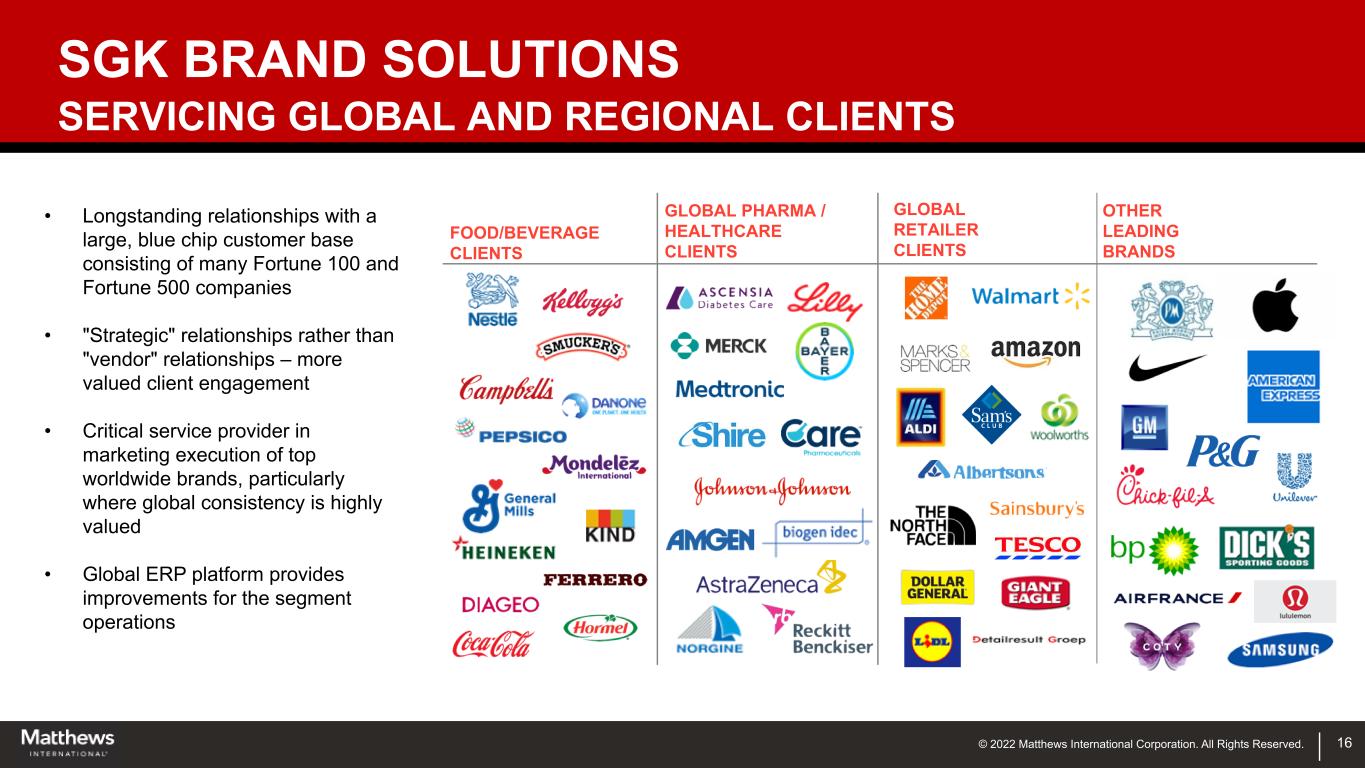 © 2022 Matthews International Corporation. All Rights Reserved. SGK BRAND SOLUTIONS FOOD/BEVERAGE CLIENTS GLOBAL PHARMA / HEALTHCARE CLIENTS GLOBAL RETAILER CLIENTS OTHER LEADING BRANDS 16 • Longstanding relationships with a large, blue chip customer base consisting of many Fortune 100 and Fortune 500 companies • "Strategic" relationships rather than "vendor" relationships – more valued client engagement • Critical service provider in marketing execution of top worldwide brands, particularly where global consistency is highly valued • Global ERP platform provides improvements for the segment operations CORE PACKAGING SERVICES BRAND SOLUTIONS SERVICING GLOBAL AND REGIONAL CLIENTS