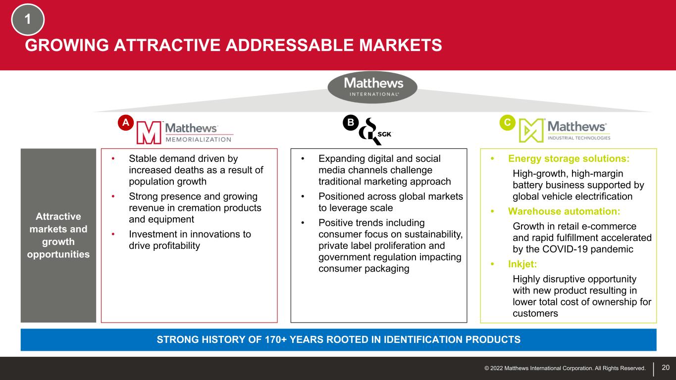 © 2022 Matthews International Corporation. All Rights Reserved. A B C Attractive markets and growth opportunities • Stable demand driven by increased deaths as a result of population growth • Strong presence and growing revenue in cremation products and equipment • Investment in innovations to drive profitability • Expanding digital and social media channels challenge traditional marketing approach • Positioned across global markets to leverage scale • Positive trends including consumer focus on sustainability, private label proliferation and government regulation impacting consumer packaging • Energy storage solutions: High-growth, high-margin battery business supported by global vehicle electrification • Warehouse automation: Growth in retail e-commerce and rapid fulfillment accelerated by the COVID-19 pandemic • Inkjet: Highly disruptive opportunity with new product resulting in lower total cost of ownership for customers STRONG HISTORY OF 170+ YEARS ROOTED IN IDENTIFICATION PRODUCTS 20 1 GROWING ATTRACTIVE ADDRESSABLE MARKETS