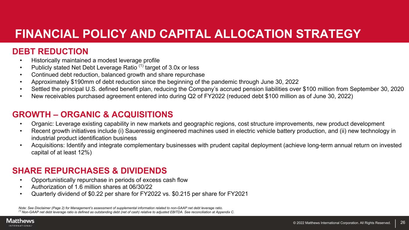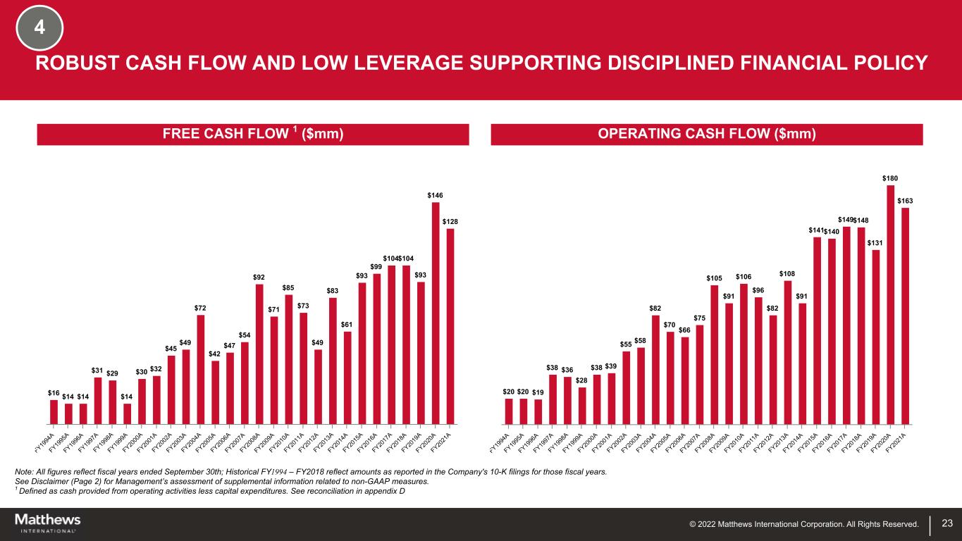 © 2022 Matthews International Corporation. All Rights Reserved. 23 Note: All figures reflect fiscal years ended September 30th; Historical FY1994 – FY2018 reflect amounts as reported in the Company's 10-K filings for those fiscal years. See Disclaimer (Page 2) for Management’s assessment of supplemental information related to non-GAAP measures. 1 Defined as cash provided from operating activities less capital expenditures. See reconciliation in appendix D $16 $14 $14 $31 $29 $14 $30 $32 $45 $49 $72 $42 $47 $54 $92 $71 $85 $73 $49 $83 $61 $93 $99 $104$104 $93 $146 $128 FY19 94 A FY19 95 A FY19 96 A FY19 97 A FY19 98 A FY19 99 A FY20 00 A FY20 01 A FY20 02 A FY20 03 A FY20 04 A FY20 05 A FY20 06 A FY20 07 A FY20 08 A FY20 09 A FY20 10 A FY20 11 A FY20 12 A FY20 13 A FY20 14 A FY20 15 A FY20 16 A FY20 17 A FY20 18 A FY20 19 A FY20 20 A FY20 21 A ROBUST CASH FLOW AND LOW LEVERAGE SUPPORTING DISCIPLINED FINANCIAL POLICY 4 OPERATING CASH FLOW ($mm) $20 $20 $19 $38 $36 $28 $38 $39 $55 $58 $82 $70 $66 $75 $105 $91 $106 $96 $82 $108 $91 $141$140 $149$148 $131 $180 $163 FY19 94 A FY19 95 A FY19 96 A FY19 97 A FY19 98 A FY19 99 A FY20 00 A FY20 01 A FY20 02 A FY20 03 A FY20 04 A FY20 05 A FY20 06 A FY20 07 A FY20 08 A FY20 09 A FY20 10 A FY20 11 A FY20 12 A FY20 13 A FY20 14 A FY20 15 A FY20 16 A FY20 17 A FY20 18 A FY20 19 A FY20 20 A FY20 21 A FREE CASH FLOW 1 ($mm)